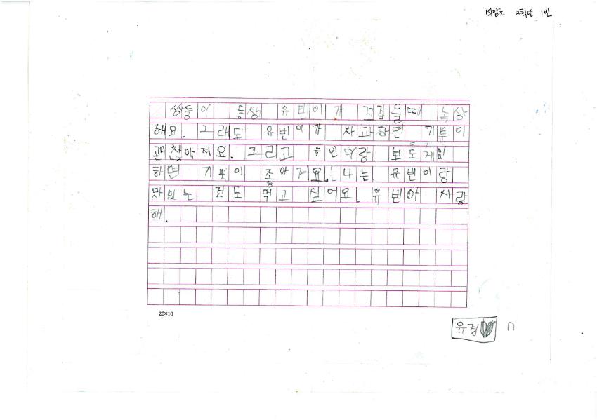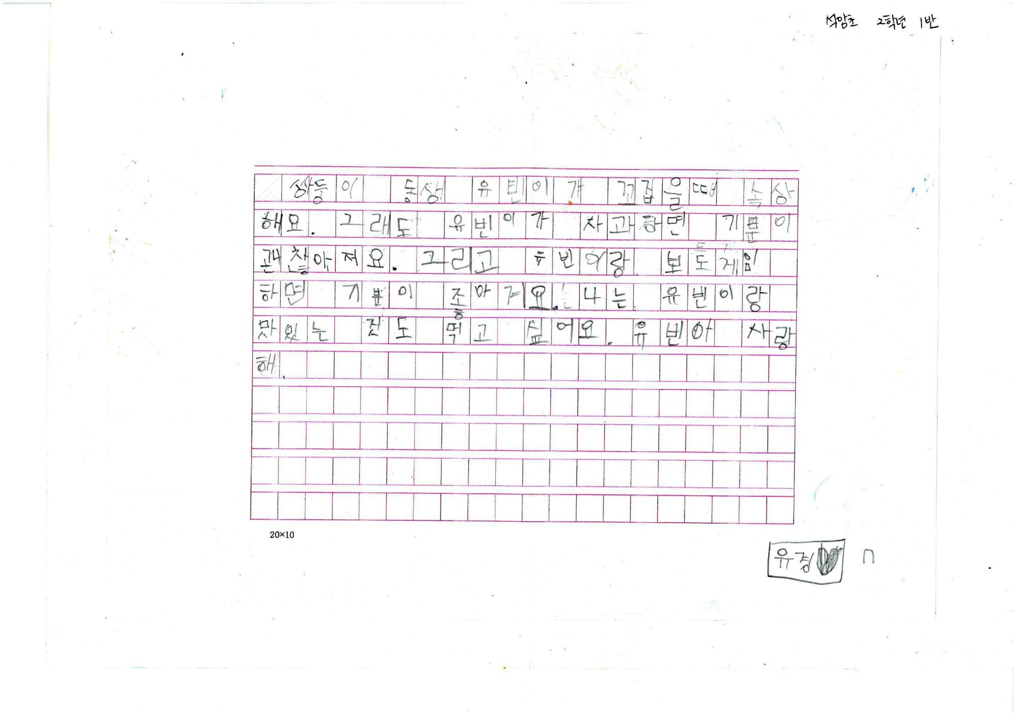 쌍둥이 동생 유빈이에 대한 마음을 글로 나타냈다. 그림은 자신과 쌍둥이 동생을 그렸다.