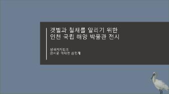 인하대학교 프런티어학부대학 세계시민성교육의 일환으로, 생태계 지킴조에서 성과공유회 시 발표한 자료이다. 제목: 갯벌과 철새를 알리기 위한 국립해양박물관 전시 -갯벌의 중요성  1) 갯벌은 우리나라 수산업에 지대한 영향을 미친다.  2) 갯벌은 육상에서 배출되는 각종 오염물질을 정화하는 기능을 가진다. -철새에게 갯벌이 필요한이유  1) 철새들은 자신들만의 이동경로가 있으며 같은 습지를 이용하려는 경향이 있다.  2) 우리나라의 갯벌이 철새들의 이동 경로중심에 위치해 있다 -문제상황   인천시민들의 갯벌과 철새에 대한 무지와 무관심   인천에 존재하는 갯벌과 철새의 자료가 찾아보기 어려움 -문제해결 아이디어  Q. 인천사람들이 어떻게 철새와 갯벌에 대한 관심을 갖고 정보를 쉽게 얻을 수 있을까?  1. 2024년 완공예정인 국립인천해양박물관에서 인천의 갯벌과 철새에 관한 전시공간을 확보한다.  2. 전시공간을 통해 사람들이 철새에 대해 정보를 얻고 관심을 갖게 만든다. -실행방법  1. 사람들의 이목을 끌 수 있는 인천의 철새지도 제작  2. 인천갯벌에 사는 철새들의 캐릭터화 • 문서쪽수: 10쪽 • 문서크기: 644KB • 관리파일(비공개) 1) 보고서 기술지 2) 기록물 활용 동의서