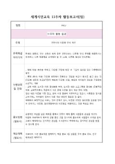 인하대학교 프런티어학부대학 세계시민성교육의 일환으로, INCU조에서 10주차에 활동한 내용을 정리한 보고서이다. - 프로젝트 주제: 인천시의 다문화 인식 개선 - SDGS 목표: 11, 16 - 문제상황 요약: 매체에서 부정적으로 비춰지는 차이나타운의 오해를 해소하기 위해서는, 다문화 이미지 제고를 위한 홍보를 활성화 해야한다. - 활동 내용: 줌 회의를 통해서 조사가 필요한 부분들에 대해서 살펴보았다. 조사할 내용들의 세부적인 부분까지 의견을 나누었다.  1. 영화나 매체에서 다루어지는 부정적인 인천(차이나타운)의 모습 ->사람들의 여론을 리뷰와 댓글을 통해 확인 => 김채은  2. 인천시 다문화 실태: 다문화 거주자 수, 다문화 관련 센터 => 김세린  3. 다문화 축제 현황: 차이나타운에서 진행했던, 혹은 진행 중인 축제 & 다문화 축제 조사 => 여경민  4. 인천에서 발생하는 다문화 문제 조사 => 김경은 • 문서쪽수: 2쪽 • 문서크기: 426KB • 관리파일(비공개) 1) 보고서 기술지 2) 기록물 활용 동의서