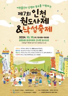 2024 인천 원도사제&낙섬축제 홍보를 위해 제작된 포스터이다. 원도사제&낙섬축제 - 일시 : 2024년 10월 19일 토요일 10:00~18:00 - 장소 : 용현5동 윤성아파트 건너편 임시도로(미추홀구 용현동 627-649 일대) • 쪽수 : 1쪽 • 크기 : 5.42MB