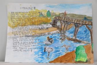 가족과 함께 용현갯골에 수업을 들으러 가서, 다양한 새를 관찰했던 모습을 그림으로 그렸다. 미추홀구에서 유일하게 볼 수 있는 바다인 용현갯골의 환경이 파괴되지 않도록 작은 활동들을 시작해나간다는 다짐이 적혀있다. 이 그림은 제3회 학산백일장 '사람과 자연이 함께하는 생태적 삶을 꿈꾸며'에서 학익유수지(학익용현갯골)을 다녀와 그린 정하연의 '용현갯골이 우리에게 주는 것' 그림일기이며, 초등부 부문 은상을 수상한 작품이다. • 생산장소 : 인천광역시 미추홀구 • 그림개수 : 1점 • 그림크기 : 8절지 • 관련파일(비공개) 1. 응시표