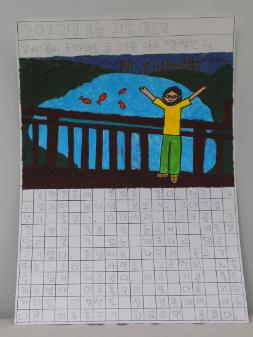 학익유수지에서 만난 다리가 긴 새 '황순이'와 놀았던 모습을 그림으로 그렸다. 이 그림은 제3회 학산백일장 '사람과 자연이 함께하는 생태적 삶을 꿈꾸며'에서 학익유수지(학익용현갯골)을 다녀와 그린 최빛찬의 '갯골 놀이터와 나의 새 친구' 그림일기이며, 초등부 부문 은상을 수상한 작품이다. • 생산장소 : 인천광역시 미추홀구 • 그림개수 : 1점 • 그림크기 : 8절지 • 관련파일(비공개) 1. 응시표