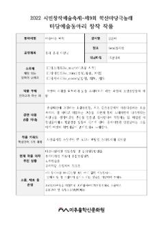2022 시민창작예술축제 제9회 학산마당극놀래 '다시,놀래' 2022 어수선 마당예술동아리 공동창작 작품 영상이다. -축제일시 : 2022년 10월 15일(토) 오후 3시~20시 -공연장소 : 수봉공원 인공폭포앞 특설무대 -작품명 : 도화동 갤러리 -장 르 : 연극 -소 개 : 곧 사라질 우리네 집. 우리네 삶터 도화동. 마을에 터를 잡고 살아가는 사람들에게 집이란 어떤 의미인가? 사라져가는 집들이 들려주는 이야기를 담은 연극 -강사 오지나 -출연 조현경, 김명순, 김성형, 김태은, 김행화, 조형란, 황순녀