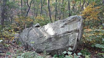 문학산의 사모지 고개를 넘어 근방에 있는 갑옷바위 일대를 찍은 사진이다. 갑옷바위의 주변에는 커다란 돌 7~8개가 흩어져 있었으나, 지금은 찾아볼 수 없이 정돈되어 있다.  [갑옷바위에 얽힌 전설]  전하는 말에 따르면 옛날에는 장수가 이 바위의 아랫부분에 석함을 파고 자기 갑옷과 투구를 감추어 놓고 그 위에다 뚜껑 바위를 덮어 놓았다고 한다. 그리고 누구든지 이 바위를 건들기만 하면 이상하게도 별안간에 뇌성벽력이 쳐서 그 자리에서 벼락을 맞아 죽었다고 한다. 그러던 어느 날 문학산 꼭대기에 있는 안광당의 당집을 지키던 당지기가 호기심이 많아 만용을 부리다가 하마터면 큰 변을 당할 뻔 했다고 한다. 즉 그 당지기는 이 바위를 깨뜨려서 그 속에 무엇이 들었는지 확인할 작정으로 뚜껑바위 아래쪽을 망치로 쳐서 깨뜨리기 시작했다. 이때 듣던 바대로 별안간 청천벽력이 일어나고 천지가 진동하는 괴변이 일어났다고 한다. 이 괴변에 넋을 잃은 당지기는 겁에 질려 그 일을 중단하지 않을 수가 없었다. 그러므로 지금 뚜껑바위 아래쪽이 떨어져 나간 것은 그때 당지기가 깨뜨렸기 때문이라고 전해진다. [출처] 한국학중앙연구원 - 향토문화전자대전 본 사진은 2019년 천영기가 촬영하여 기증한 사진이다. • 촬영장소: 문학산 갑옷바위(문학동) • 촬영일자: 2019년 5월 31일(일) • 사진크기: 4896x3904 • 사진장수: 1장