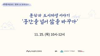 2021 지역인문 집담회 '문화가 있는 도시 미추홀' 코로나19이후, 지역 단위 문화의 중요성이 대두되고 있습니다. 지역 고유의 문화를 일궈가기 위해서는 지역 장소의 생태성을 형성하고, 미학적 관점을 모색하는 등 개인과 지역의 인문적 태도가 중요합니다. 더하여 도시의 시민들은 스스로 지역 고유의 문화적 가치를 인식하고, 지역문화의 발전과 공동체성 회복을 위해 주체적으로 참여해야 합니다. 이런 배경에서 미추홀구는 문화가 있는 도시를 시민들과 함께 어떻게 만들어 갈 수 있을지 서로의 생각을 나누어 보는 자리를 진행했습니다. -일정 : 2021년9월17일(금) 10~12시 -운영 : 미추홀학산문화원 유튜브 생중계 -프로그램 1. 발제 *'문화도시' 정책과 필요성 _최영화 (인천연구원 도시사회연구부 연구위원) *'미추홀구의 장소 구성'과 문화가 있는 도시 _김민수 (도시상공업연구자네트워크 (준)연구원) *문화가 있는 도시와 '미학적 몸 만들기' _임지연 (생명정치재단 상임이사 / 미학의 집 소장) 2. 질문답변 *함께 고민하는 '문화가 있는 도시' 미추홀 - 발제자 최영화, 김민수, 임지연 - 미추홀 시민패널 : 윤종필 (Collective Community Studio525 대표, 작가) : 이병국 (시인, 문화평론가) : 청산별곡 (문화기획자, 수봉정류장 운영) : 민후남 (마을활동가, 꽃차마실 운영) : 이혜숙 (마을활동가, 그림꽃 운영)