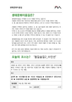미추홀시민로드-생태문화이음길 4차시 문학산길2의 강의자료이다. 제작되어 참여자들에게 배포되었으며, 생태문화이음길에 대한 소개와 코스에 따른 사진들이 첨부되어있다. 생태문화이음길은 미추홀의 생태문화를 종합적으로 둘러볼 수 있는 탐방과정이다. 이 과정을 통해 미추홀의 산, 물, 길을 따라 걸으며 지역의 지형을 바라보는 시야를 넓혀가고자 한다. • 쪽수 : 8쪽 • 크기 : 1,070KB