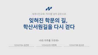 미추홀학산문화원 - 인하대학교 프런티어학부대학 세계시민성교육  인하대학교 프런티어학부대학 세계시민성교육 중 9조 '미추홀 구조대'가 발표한 자료이다. •제목 : 잊혀진 학문의 길, 학산서원길을 다시 걷다 •학산서원이란 인천시 미추홀구에 있었던 조선 후기 문신이자 학자인 이단상을 추모하기 위해 창건한 서원 •학산서원길 탐방 학익1동 행정복지센터->양토마을->학익배수지->문학레포츠공원->학산서원터->중바위, 갑옷바위 ->연경정->노적봉->송암점자도서관 •문제상황 요약  1. 낮은 접근성 •문제해결 아이디어  1. 이정표 추가 설치 2. QR코드를 이용한 경로 안내 •문서 쪽수 : 15쪽 •문서 크기 : 53.4MB •관리파일(비공개) 1. 보고서 기술지 2. 기록물활용동의서