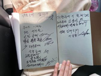 숭의목공예마을 나무장인이야기 '나뭇결 따라 살아온 삶' 도서에 구술자 19인의 서명이 있다. '나뭇결 따라 살아온 삶' 도서는 2023년 3월 20일에 발간되었으며, 목공장인 19인의 생애와 직업에 대해 구술인터뷰를 한 내용을 담고 있다. • 촬영장소 : 미추홀구 숭의동 • 촬영일시 : 2023년 3월 29일 • 사진크기 : 4032x3024 • 사진장수 : 1장