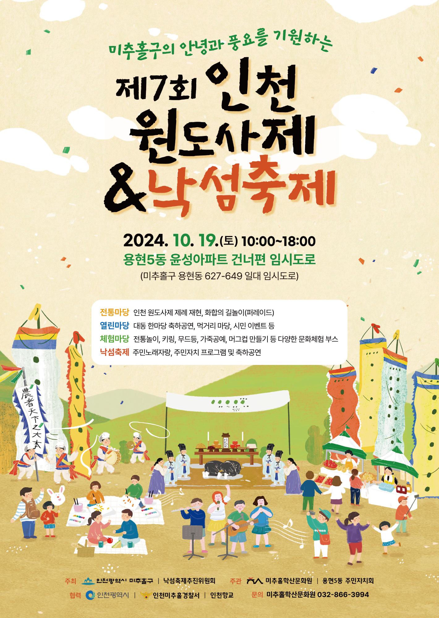 2024 제7회 인천 원도사제 예로부터 우리 선조들은 이름난 큰 산이나 하천과 바다에 나라와 고을의 안녕을 빌고 복을 구하는 제사를 지냈습니다. 바다의 경우, 조선시대에 인천과 순천, 강릉 등에서 제사를 지냈는데, 이 중 인천도호부에서는 원도〔낙섬〕에서 서해의 신에게 제사를 지냈다고 합니다. 조선시대 원도에 설치된 원도사라는 사당에서 왕을 대신해 인천의 지방관이 여러 섬의 신주를 모아 봄과가을에 지내던 제사가 인천 원도사제입니다. 조선시대 인천 원도사제 제례 재현 조선 시대 ‘원도사(猿島祠)’라는 사당에서 왕을 대신해 인천의 지방관이 여러 신주를 모아 봄과 가을에 지내던 인천 원도사제(猿島祠祭) 제례를 재현합니다. 1) 사전준비 헌관과 집사 제례 준비 (헌관 : 미추홀구청장, 미추홀구의장, 미추홀학산문화원장) 2) 전폐례 신에게 향과 폐백을 올리는 의식 *폐백 [幣帛] : 신에게 드리는 예물 3) 작헌례 신에게 술잔을 3차례에 걸쳐 올리고 음복하는 과정 ① 초헌례 : 첫 번째 술잔을 올리고, 축문을 읽는 초헌례 ② 아헌례 : 두 번째 술잔을 올리는 아헌례 ③ 종헌례 : 세 번째 술잔을 올리는 종헌례 ④ 음복수조 : 헌관이 제물로 드린 술과 음식을 음복함. *헌관 : 일반적으로는 제사를 지낼 때 제관을 대표해 잔을 드리는 사람을 말한다. 4) 송신례 전폐례와 작헌례를 통해 신에게 드리는 예는 끝나고, 신을 돌려보내는 과정 ① 제단에 설치한 제수를 치우는 ‘철변두’ ② 축판과 폐백 등을 물에 담그는 ‘망예(望瘞)’ ③ 제례가 끝났음을 알리는 ‘예필(禮畢)’ 축제 개요 주최 인천광역시 미추홀구, 낙섬축제추진위원회 주관 미추홀학산문화원, 용현5동 주민자치회 협력 인천광역시, 인천미추홀경찰서, 인천향교 일시 2024년 10월 19일 토요일 10:00 ~ 18:00 장소 용현5동 윤성아파트 건너편 임시도로 (미추홀구 용현동 627-649 일대) 프로그램 시간 프로그램 장소 09:40~10:20 제례 길놀이 - 원도사제깃발, 동별깃발 - 내외빈 및 시민 - 취타대, 대북, 모듬북, 현대무용 - 풍물패, 마칭 원도사터 출발 행사장소 도착 10:20~10:40 개막식(내외빈 소개 및 인사말) - 미추홀구청장 외 본무대 10:40~11:30 원도사제 의례 재현 11:30~12:05 축하공연 '인천, 섬과 바다 그리고 우리' - 라온두드림, 무빗이매진, 풍물패 더늠 12:10~18:00 주민 참여 한마당 - 공연, 체험, 먹거리, 푸드트럭, 전통놀이 외 행사장 내 부스 및 본무대 ※ 체험부스운영 11:00~17:00 ※ 먹거리 판매 종료 17:30 주민과 함께 하는 길놀이, 축하공연 원도사제 제례 길놀이(전체 축하공연 출연진 및 시민) : 지역의 번영과 시민들의 안녕을 기원하는 길놀이 인천향교, 내외빈, 공연팀, 인천시민 등 시민들이 마음을 모아 퍼레이드를 함께 합니다. *길놀이 퍼레이드 행렬 : 원도사제 깃발, 취타대, 제례 헌관, 깃발놀이, 대북 모듬북 연주자, 내외빈, 21개동 깃발, 마칭밴드, 현대무용, 풍물패 등 시민 참여 축하공연 ‘인천, 섬과 바다 그리고 우리’ 인천 앞바다의 섬 생활과 만선을 이루기 위해 역경과 고난을 이겨내는 모습과 현재 진취적인 미추홀구 21개 동의 기운을 담아, 섬과 바다의 안녕을 염원하며 미추홀구민이 하나로 화합합니다. 축하공연 프로그램 출연 프로그램 라온두드림 대북과 모듬북의 웅장한 소리로 바다의 생명을 깨우고, 사람들을 모으다. 무빗이매진 풍어의 염원과 만선의 꿈을 담아내다. : 바다의 도시 인천이 가지고 있는 섬에서의 생활, 항해, 고기잡이, 고난과 역경, 만선의 염원, 기쁨 등을 몸짓에 담아낸다. 풍물패 더늠 모든 사람의 평화와 안녕을 염원하다. 마칭밴드 연주를 시작으로 미추홀의 21개 동을 상징하는 깃발이 무대 위로 올라와 각 동을 알리고, 대형 인천원도사제 깃발이 어우러지며 미추홀구가 원도사제를 통해 하나됨을 표현한다. 전체 출연진 서로 어우러지며 마음을 이어내다. 농악대의 연주를 바탕으로 전 출연진이 모두 무대에 오르는 화합의 대동놀이 퍼포먼스를 통해 제7회 인천원도사제 피날레를 장식한다. ▷더 많은 이야기는 아래 연결된 기록물을 확인하세요.