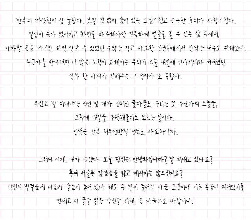 이로인해 서로가 안부를 묻고 반가움을 나누는 평범함이 평범하지 않은 순간이 되었습니다.