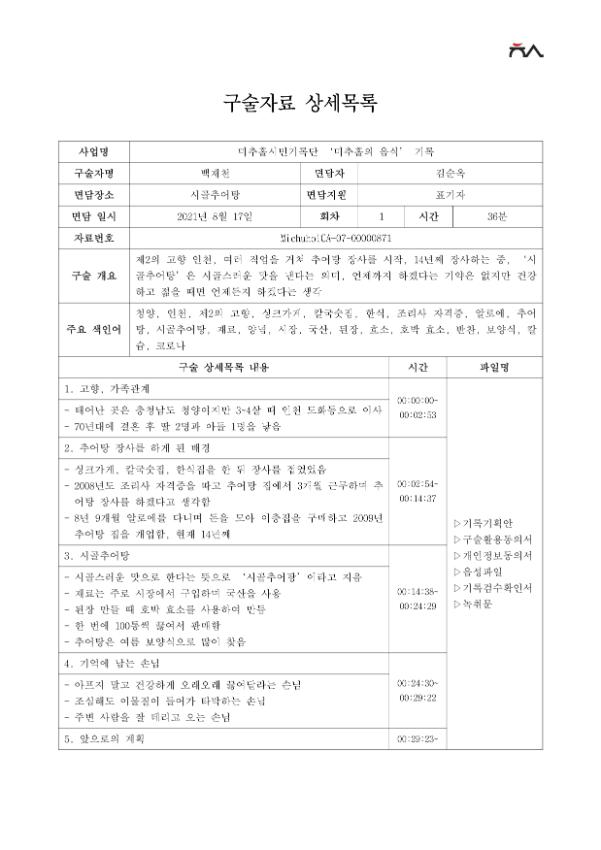 오랜 시간 미추홀구에 터를 잡고 살아온 사람의 음식 이야기를 기록하기 위해 구술인터뷰 진행