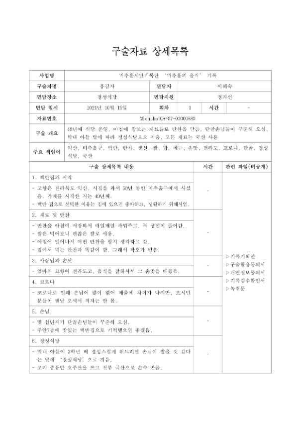 오랜 시간 미추홀구에 터를 잡고 살아온 사람의 음식 이야기를 기록하기 위해 구술인터뷰 진행