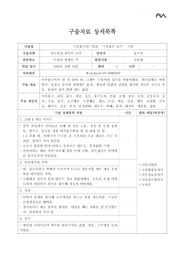 오랜 시간 미추홀구에 터를 잡고 살아온 사람의 음식 이야기를 기록하기 위해 구술인터뷰 진행