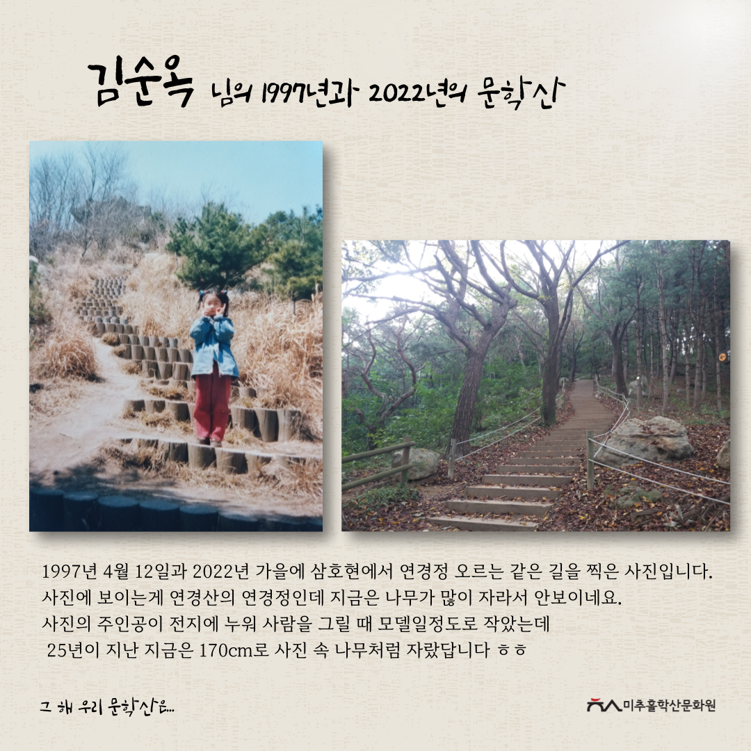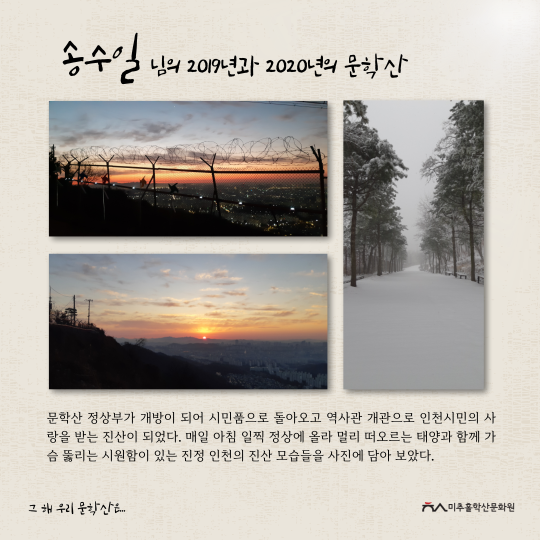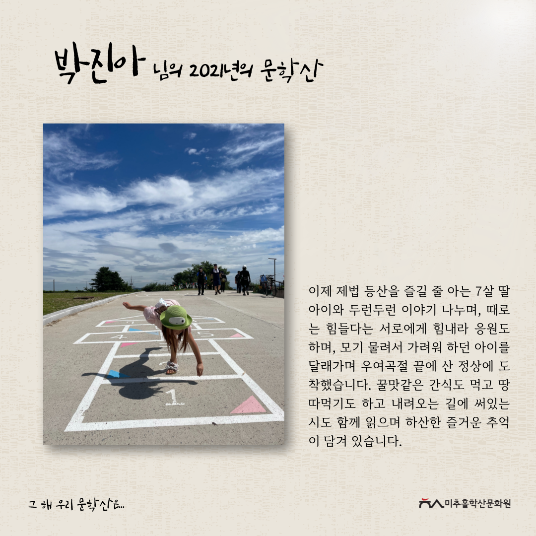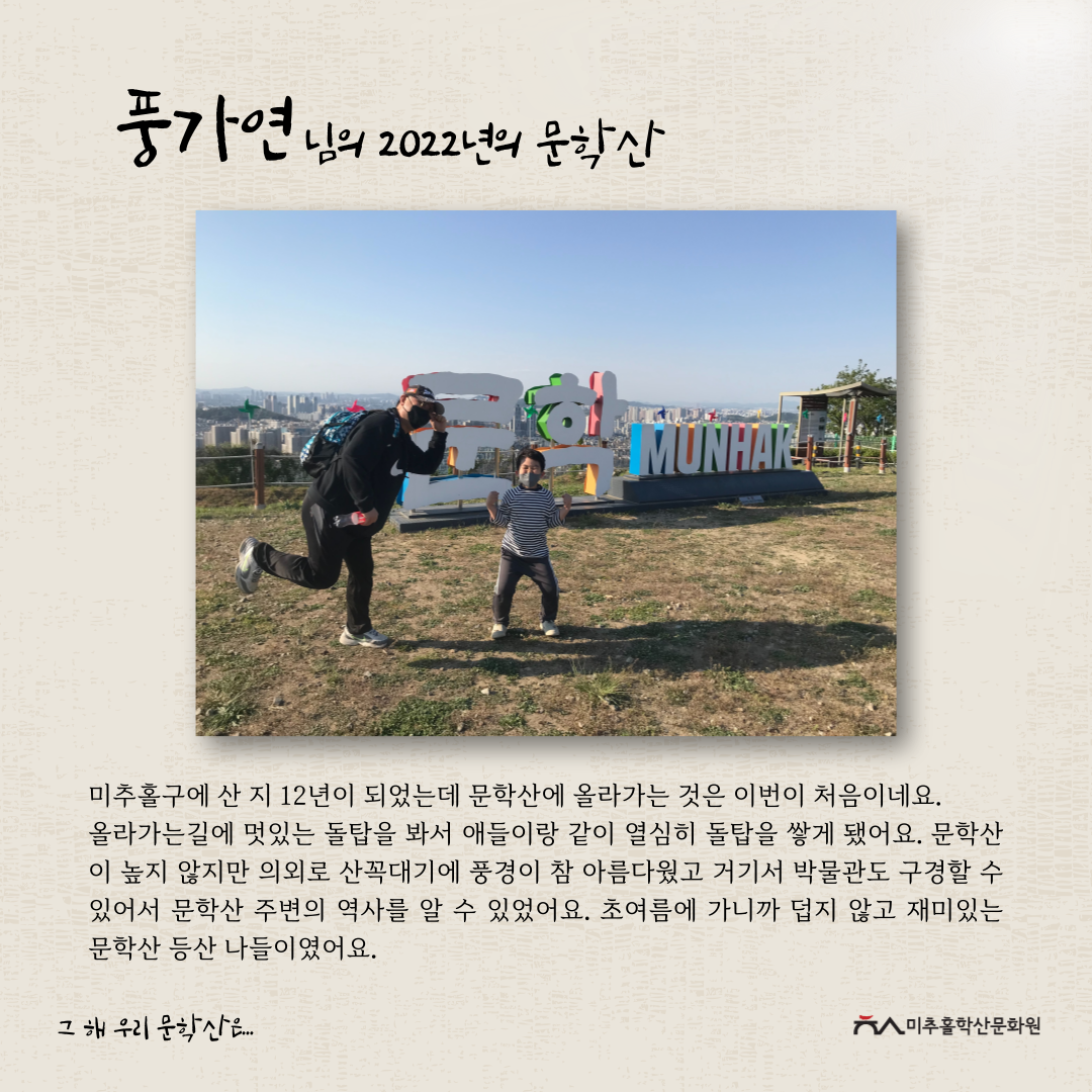 이번 공모전을 통해 각자의 기억 속 문학산의 추억을 되새기며 미추홀구의 지역문화자원을 새롭게 바라보고 기록을 쌓아가는 좋은 시간이 되었다고 생각합니다.
