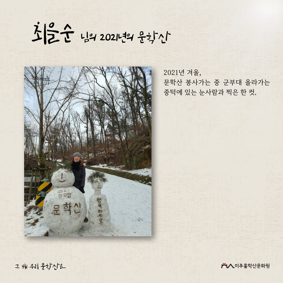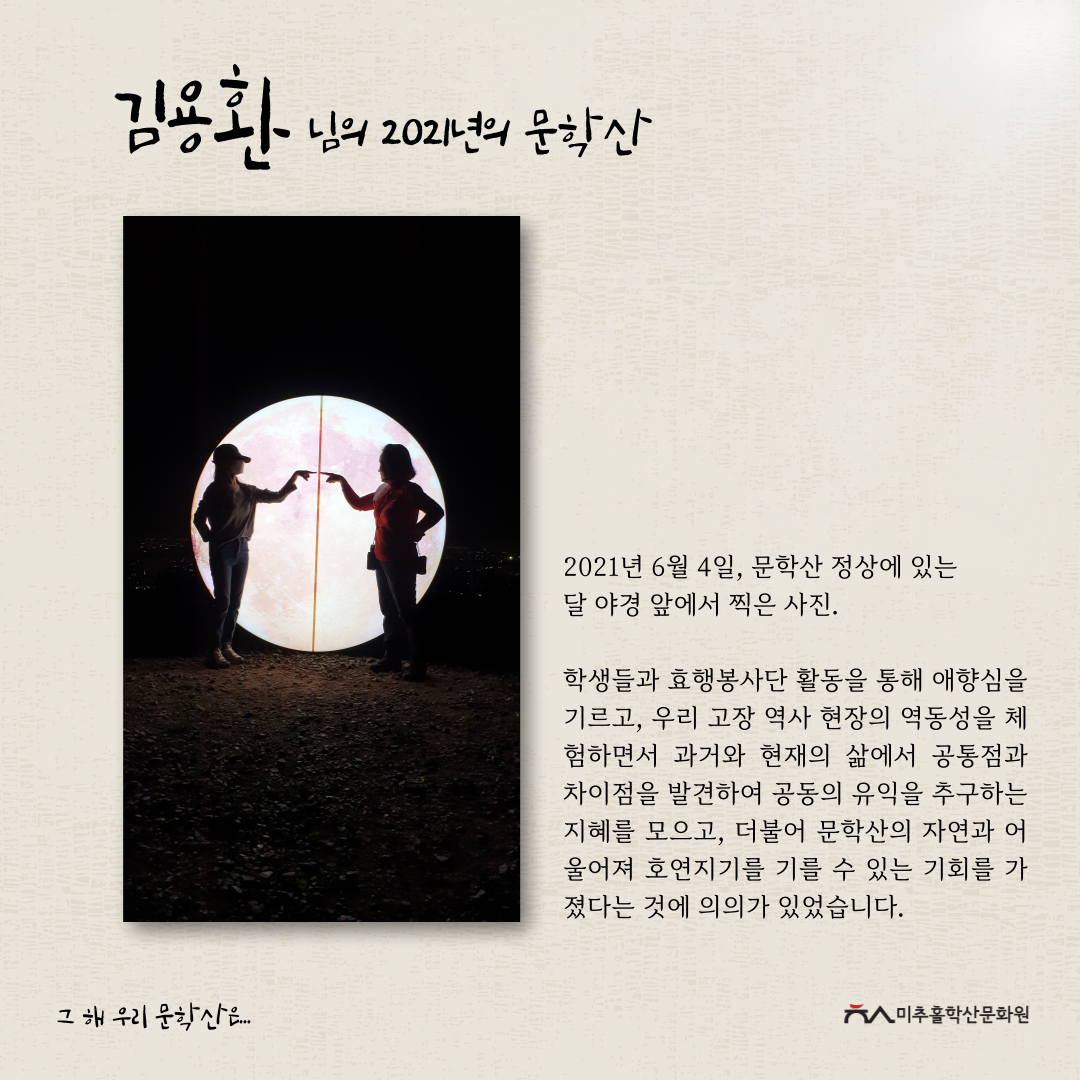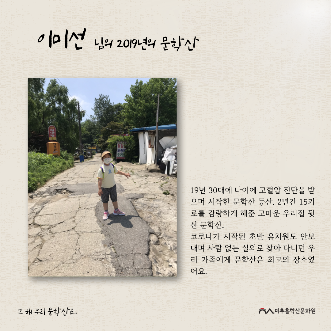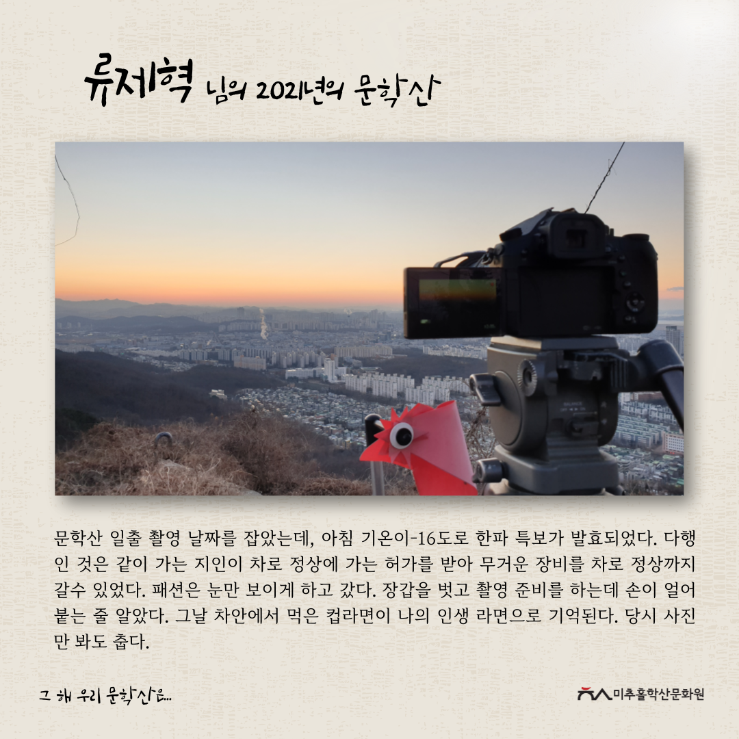 이번 공모전을 통해 각자의 기억 속 문학산의 추억을 되새기며 미추홀구의 지역문화자원을 새롭게 바라보고 기록을 쌓아가는 좋은 시간이 되었다고 생각합니다.
