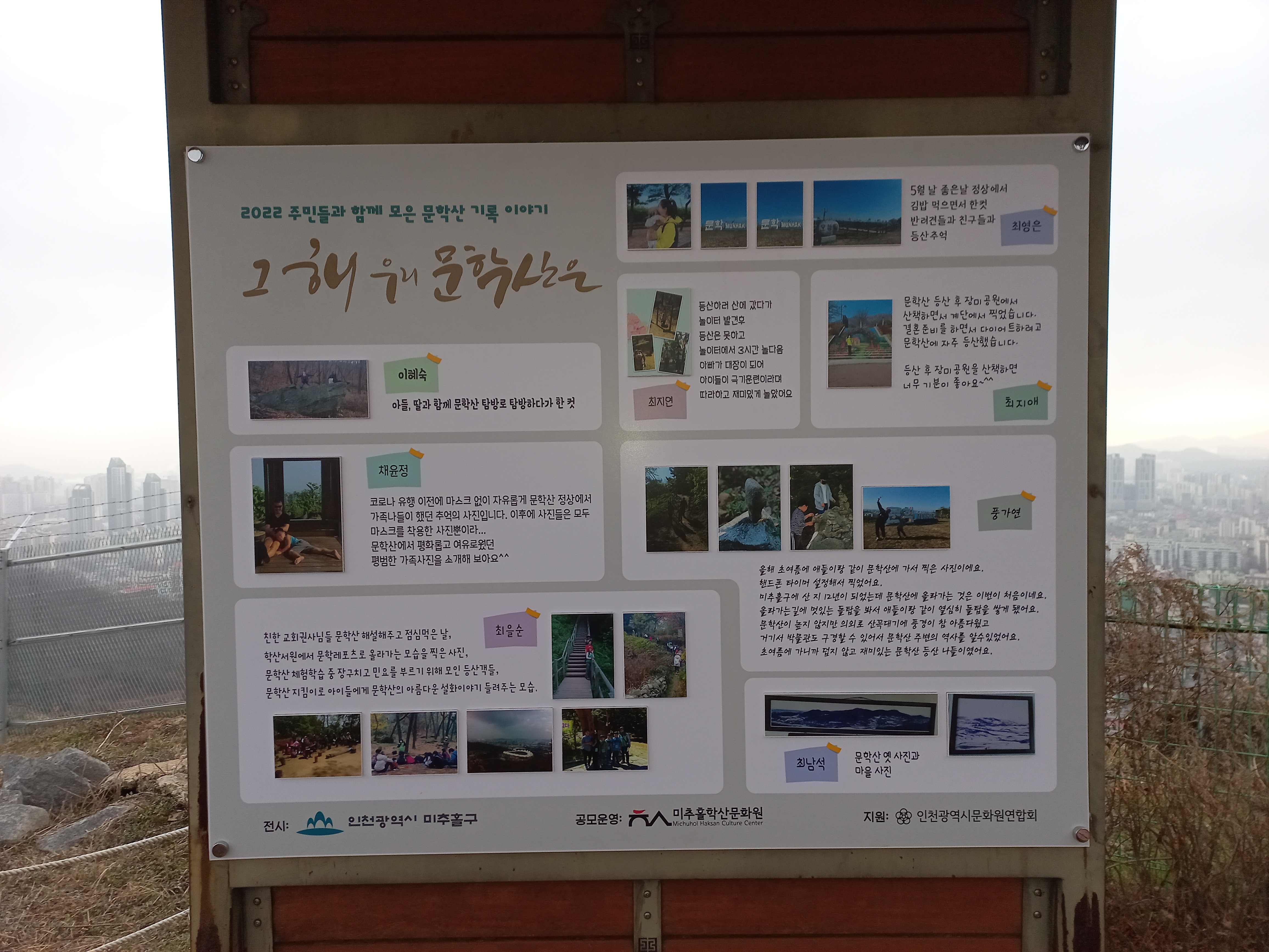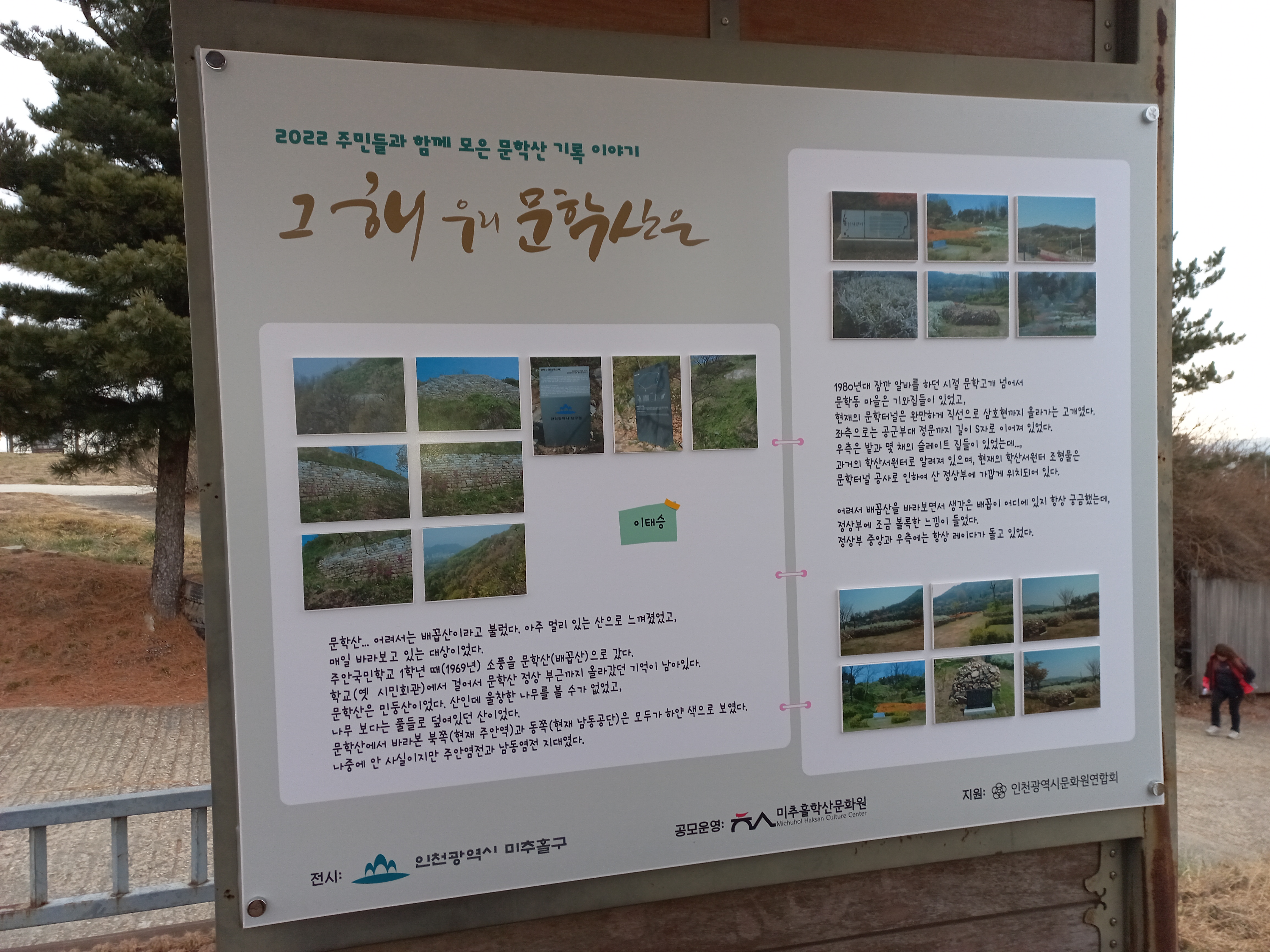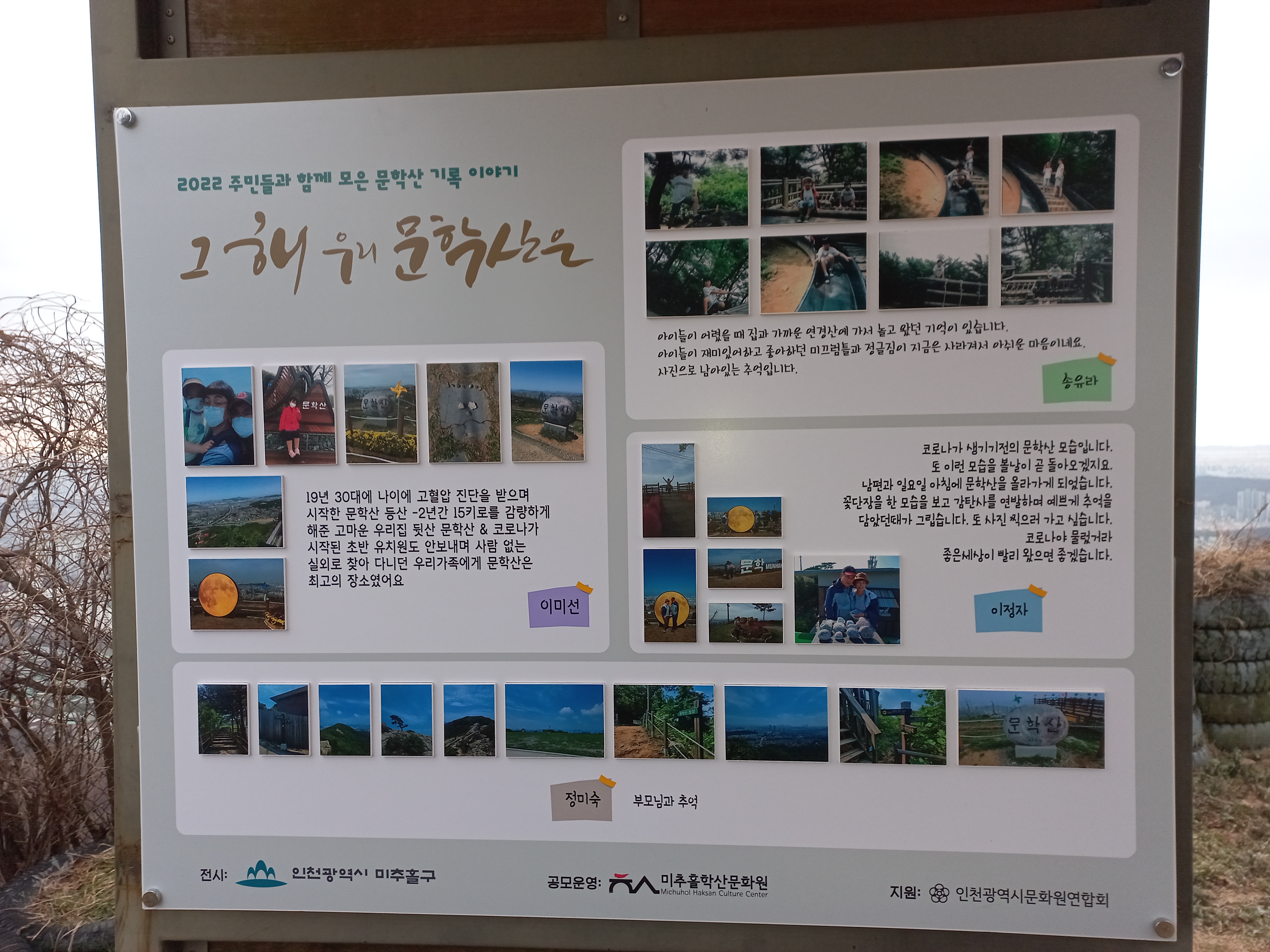 이렇게 수집된 귀중한 사진과 이야기들은 미추홀구 문화유산과와 연계하여 문학산 정상에 전시를 진행하고 있습니다.