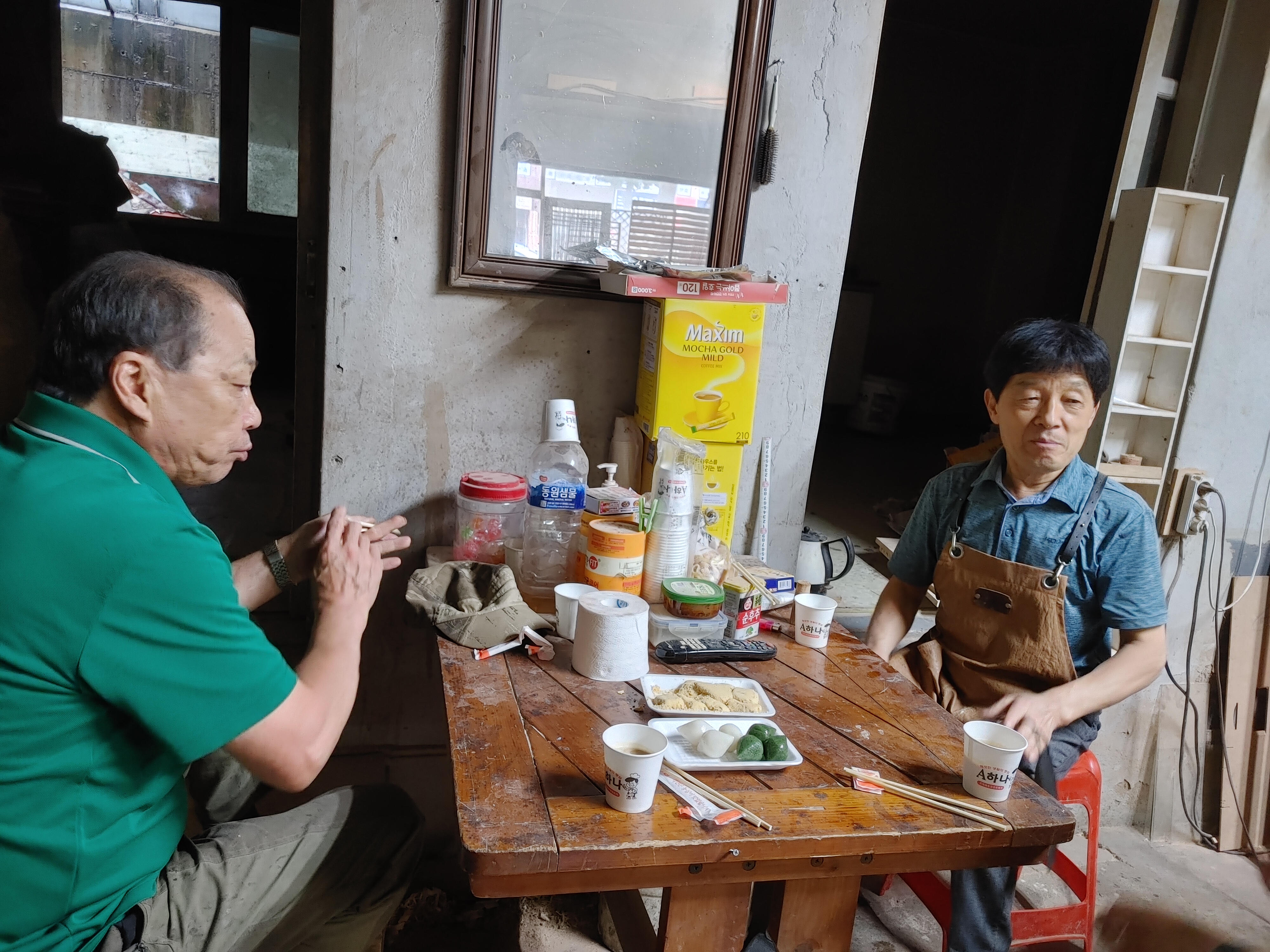 원래 내가 미추홀공예 자리에 있을 당시에 미추홀 공예 사장(상감기법 장인)은 서구 쪽에서 엄청 큰 공장을 운영했던 사람이었더라고요. 당시 서구에 목공예사들이 많이 모여서 했더라고요. 거기서 직원도 많이 두고, 아주 잘하다가 우리 옆 가게로 이사 왔더라고요. 한 10년 됐는데, 일하는 부분에서 잘 맞고, 서로 이해하니까 친해진 것 같아요. 꼭 이 사람이랑 오후에 한 4시 정도 되면 아주 습관적으로 여기서 그냥 한 잔 먹고, 또 조금 좋을 때는 나가서 대폿집 가서 한잔하고 그래요. 주로 대폿집에 가는데 조금 되는 날은 장어집 가서 한 잔, 곱창집 가서 한 잔. 안 그러면 여기서 한 잔 마시고. 좋아요. 일하는 데 힘도 나고.