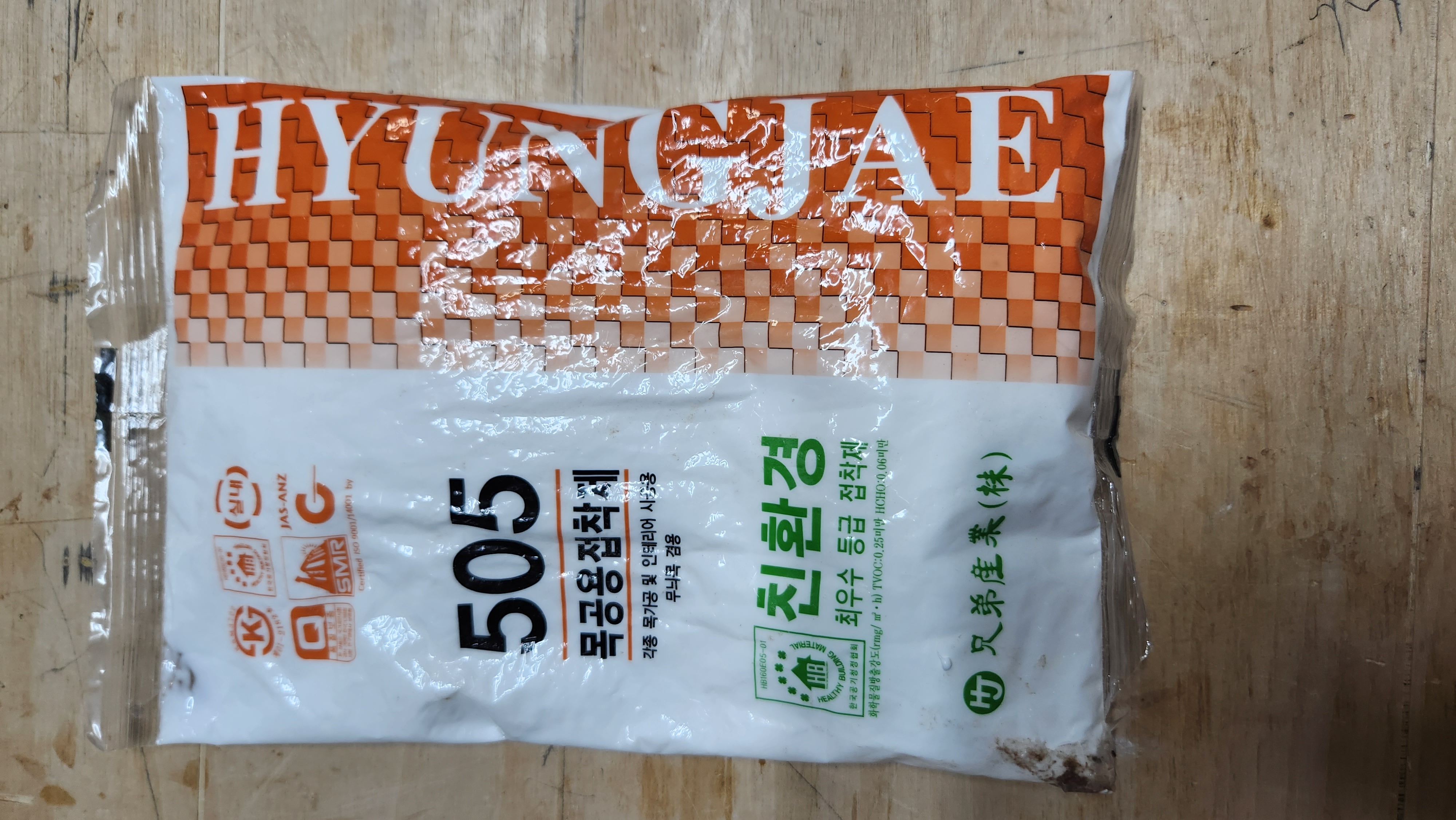 문틀은 구멍에 맞춰서 끼우느냐고 나사로 하는 거라 본드를 안 써요. 그런데 문짝 만들 때나 창살 만들 때, 그리고 가구 만들 때는 꼭 들어가야 돼요. 이름은 ‘505’도 있고 뭐 공수가 다 다르지만. 저는 ‘505’ 목재 본드를 써요. 우리 같이 조금씩 제작하는 거는 저 목재 본드가 꼭 들어가야 됩니다. 나중에 나무라는 건 마르게 돼 있으니까, 마르면 헐렁헐렁 해져. 그런데 이 목재 본드로 딱 해놓으면 짱짱하죠. 이런 데 붙여서 했을 때 나무까지 같이 붙어서 따로 떨어지지 않아요. 아마 저거 만든 회사는 진짜 땡큐예요(하하하).