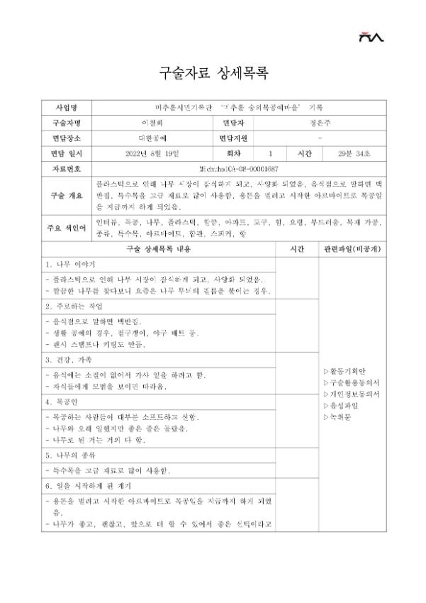 나무가 생활 가구로서 계속 접해져 있다가 시대가 변하고 발전되다 보니까 이제 플라스틱이 들어왔어요. 플라스틱이 지금은 많이 사용되지만, 당시에 공예품이라는 게 전부 다 나무로 만들어졌다가 플라스틱이 들어왔는데 그게 나무 시장을 잠식을 한 거예요. 그러다 보니까 나무 시장이 사양화 되기도 했고요.시대가 이제 좀 흐르다 보니까 나무라는 개념을 어린애들은 잘 모르는 거예요. 요즘에 다시 나무라는 것을 젊으신 분들이 나무가 좋다는 것을 간접적으로 아시고 온라인을 통해서 나무라는 게 이런 거구나 간접적으로 접하다 보니까 나무를 점점 알게 되는데 나무가 플라스틱 비슷한 줄 알아요. 사람들은 나무가 깨끗해야만 되는 줄 아는데 나무는 이렇게 보면 옹이도 있고 광솔이라고 그러죠. 광솔도 있고 그래요. 소비자분들이 깔끔한 것만 찾으니까 소비자에게 맞춰줘야 돈을 버는데 나는 나무 외에는 안 할 거야 이렇게 고집만 세우다가는 경제적으로 힘들어지지. 돈도 벌어서 자식들도 가르치고 해야 되는데. 소비자분들이 깔끔한 것만 찾으니까 업자들은 그냥 깔끔하게 가자 그러다 보니까 그에 맞는 나무를 만들게 된 거예요. 이렇게 압축을 해가지고 나무처럼 깔끔하게 만들어가지고 거기에 나무 무늬를 붙인 거예요. 아파트가 들어오면서 나무라는 게 점점 설 자리가 없는 거죠.