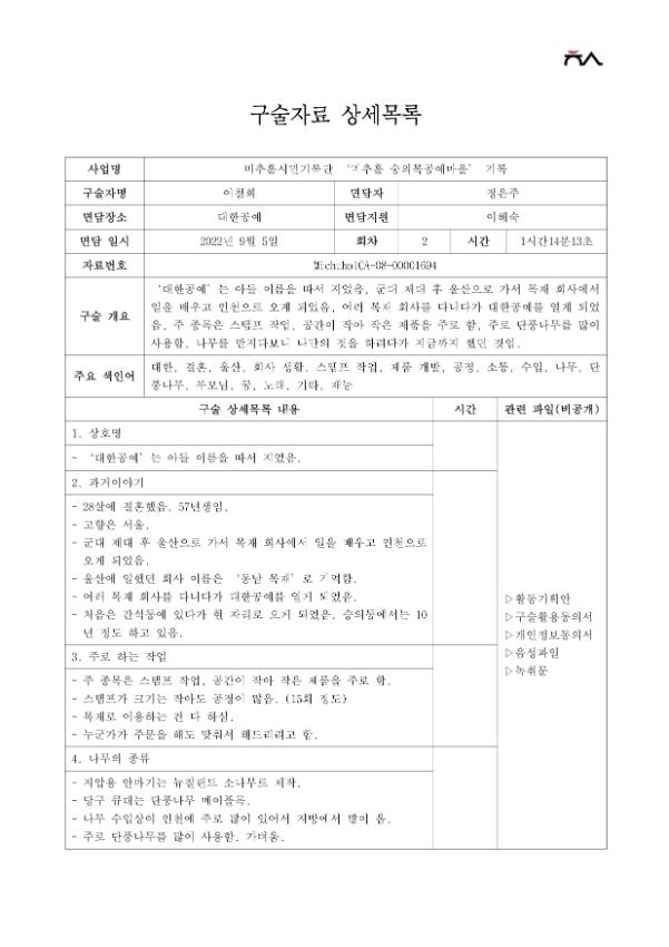 태생은 서울이고요. 군대 제대를 하고 울산에 자리가 있기 때문에 그리로 갔었는데 공교롭게 거기도 목재 회사더라고요. 뭔지 알지도 못하고 가보라 해서 무작정 가봤는데 거기서 일을 조금 더 배우고 나서 인천으로 오게 됐죠. 울산에서 근무했던 회사가 아마 동남 목재로 기억을 해요. 회사 생활을 거기서도 하고 인천에 와서도 회사 생활을 했는데 사실 회사 생활에서는 제가 뜻하는 대로 오래 있지를 못했어요. 당시에 오래 있었던 데가 2년, 3년 이렇게 있었는데 거의 다 회사가 부도가 나고 해가지고 오래 못 있었어요. 인천에도 마찬가지로 목재를 해서 가구 만들고 인천에 몇 군데 있잖아요. 인천에 가구 만드는 회사들이 있었던 곳이 지금은 이제 없어졌죠. 거기서도 부도가 났어. 가는 쪽마다 이렇게 부도가 나더라고. 그래서 직장생활이나 하려고 그랬는데 그것도 안 되고 그래서 적은 자본으로 할 수 있는 게 뭔가 생각했더니 내가 할 수 있는 일은 소자본으로 할 수 있겠더라고요. 처음부터 여기에 있지는 않았고요. 처음에 있었던 곳이 간석동이라는 데 있어요. 거기가 전체적인 재개발은 아니고 건물을 짓고 하다 보니까 이전하게 됐어요. 그래서 대한공예사를 하게 된 거예요. 저는 여기 이분들보다는 좀 늦게 왔다고 보는데 이분들은 원래는 여기보다는 배다리 쪽에 이 사람들이 거기 있다가 거기가 지금 아시다시피 정리가 됐고 그분들이 여기 와서 터전을 잡고 있는데 여기 계신 분들은 거의 한 20년 이상 된 사람들이 많죠. 나는 여기 한 10여 년 있었나요.
