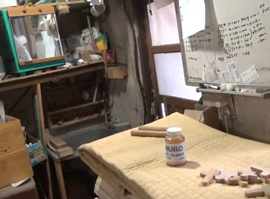 나뭇결 자체도 이쁘게 더 나오고 손에 이제 닿는 거니까 더 질감도 좀 좋게 하려고 써요. 오일은 독일산 거랑 외국 건데요. 수입품. 처음에 갈 때 초벌. 초벌을 하면 이게 느낌이 확 다를 거예요. 이 느낌하고 뭐 이런 스타일도 좋아하시는 분들은 좋아하고 그렇죠. 이건 천연 아로마 오일인데 고객들이 손에 쥐어야 되니까 이걸로 써요. 니스는 생활 가구에 들어가는 건데 이거는 천연 아로마 오일이기 때문에 인체에 유해하지 않은 재료로 만들거든요. 1차로 연마가 되면 2차로 또 바르죠. 이제 좀 스며들게 놔뒀다가 바르면 마감으로 한 번 더 바르는 거죠. 이거 오렌지 향 나죠.
