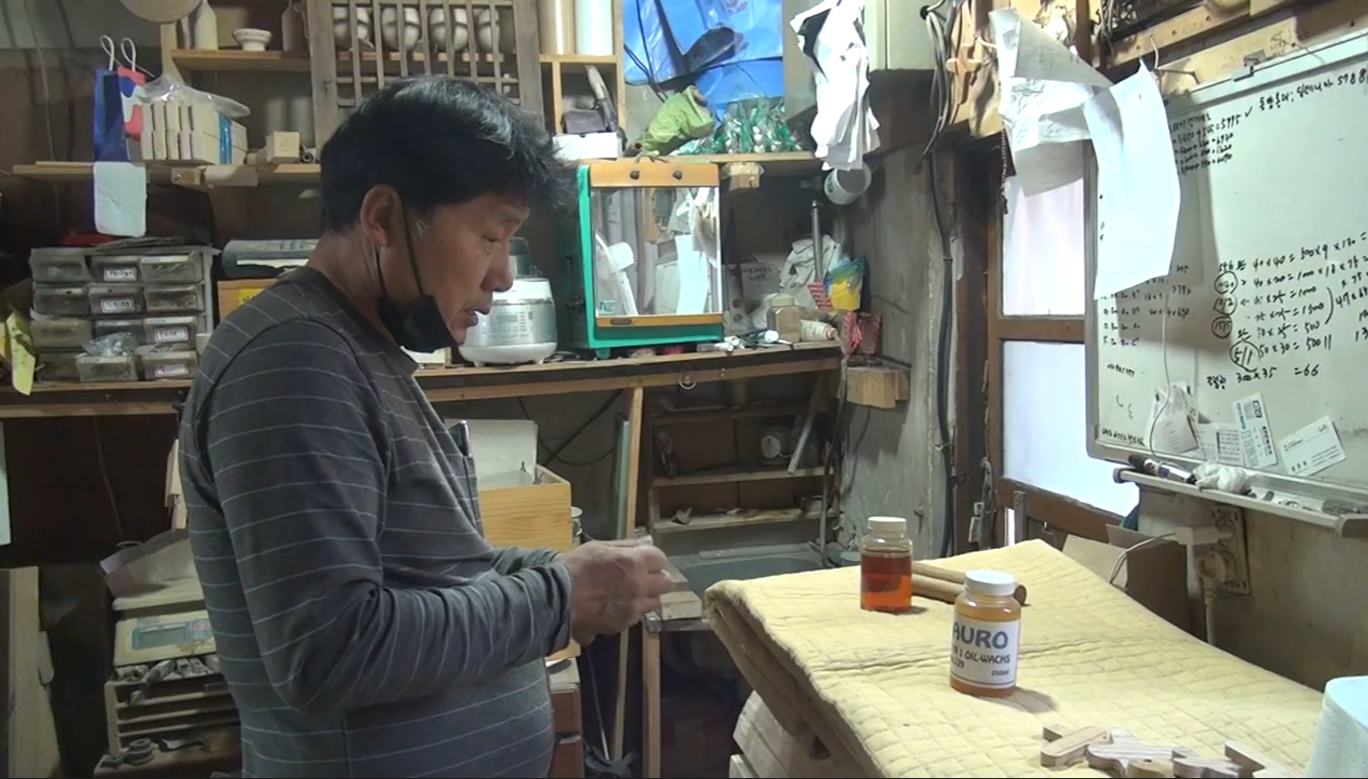 많이 좀 변했지. 그래서 예전에 어머님들은 동백기름이나 참기름, 들기름으로 장롱이나 가구를 손질하면서 애장품으로 갖고 계신 거죠. 지금은 시대가 변했기 때문에 달라진 거지. 오일 바르는 기법이 우리 어머님들 손에서 이렇게 전해왔다고 보시면 됩니다.
