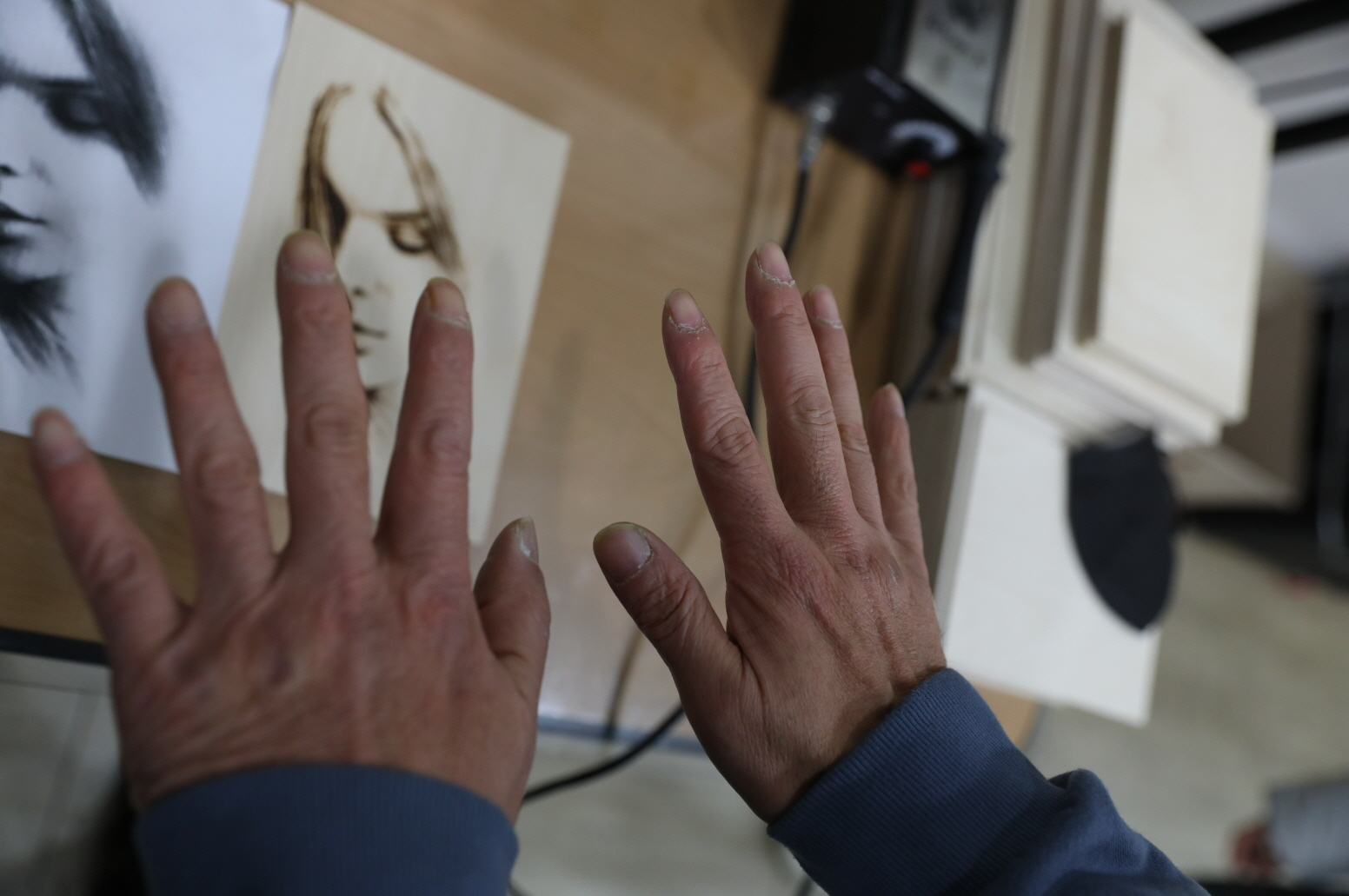 버닝 순서라면은 (직접 시연을 하시며) 예를 들어서 도안을 판재에다가 올려놓고, 전사를 하는 거죠. 전사는 뒷면에다가 먹지를 대고 그림 따라서 하는 거예요. 그러면 여기(판재)에 밑그림 도안이 배겨지겠죠. 그 상태에서, 버닝기를 켜고 나무를 태우는 거예요. 그러다 보면 나무에 그릴 수 있는 거죠. 이런 걸 우드버닝이라 하는데 그냥 이렇게 있으면 작품보다는 판재 같은 느낌이 드니까. 액자에 껴 놓으면은 작품이 완성되는 거죠.