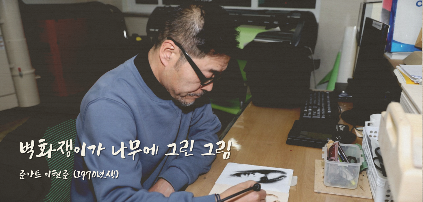 말년 휴가 때였어요. 친구의 누님이 “나랑 같이 학원 다닐래? 제물포에 ‘공간디자인 학원’이라고.” “좋아요.” 그래서 국가고시 ‘광고도장기능사’라는 자격증 취득하고. 학원 원장님이 또 “동대문에 있는 회사에 한번 가 볼래?” “좋아요.” 그래서 동대문 회사 출판사 프로덕션에 가서 디자이너로 있는 와중에, 제가 군대 가기 전에 아르바이트했었던 형님이 전화가 온 거예요. 그분이 학원 원장님 됐다고. “속셈학원 올라오는 계단 벽이 좀 휑하니까, 애들을 위해서 여기다 그림을 넣었으면 좋겠다.” 그래서 이젤이나 캔버스에다가 그림을 그렸던 사람이 처음으로 큰 벽에다 그리고 하는데 그게 굉장히 매력이 있더라고요. ‘야, 이거 재밌는데. 해볼 만하겠는데.’ 싶어 그때부터 회사를 그만두고 벽화를 시작했죠. 그 학원 원장 형님한테 혹시 빈 교실이 있냐고 했더니 “교실이 많다.”고 하나 쓰라고. 거기 학원 한편에다가 사무실을 차려 놓고. 그게 95년도. 그렇게 그렇게 흘러서 벽화를 처음 시작하게 된 거죠.
