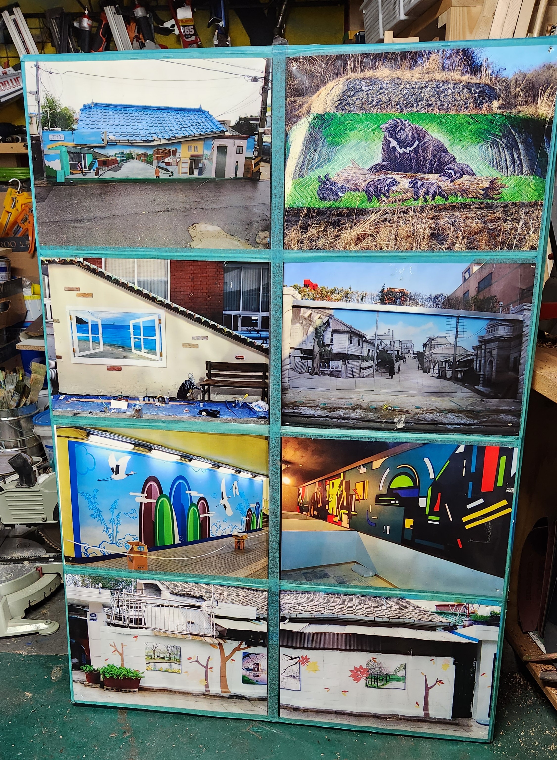 그 당시에 거의 독학이었죠. 소재도 벽이라는 소재가 시멘트만 있는 건 아니잖아요. 샌드위치 판넬이라는 것도, 철제도 있고, 플라스틱 계열도 있고, 벽돌도 있고. 소재가 워낙 다양하고 하물며 벽이라는 건 또 유리일 수도 있어요. 그 당시에 어디 가서 물어볼 데가 없었죠. 제가 극장 계통에 있던 사람도 아니었기 때문에 찾아볼 데도 많지 않고 그나마 그때 인터넷이 조금 될 때였을 거예요. 인터넷 찾다 보니까 ‘벽화’ 쳐보면 옛날에는 ‘고분벽화, 쌍영총’ 그거 나올 때였어요. 2000년대 들어서면서 상업 벽화부터 서양화 전공하거나 동양화 전공한 분들이 벽화에 대해서 인식이 조금씩 생기다 보니까 많이 하셨어요. 저한테는 도움이 됐던 게 뭐냐면은 같이 대화를 나누고, 어깨 너머로 그림을 배울 수 있는 그런 환경이 조성이 된 거였어요. 디자인을 전공했었어도 다양한 사람들과, 회화 전공자들과 같이 그림을 하다 보니까 어깨 너머로 그 사람들의 터치라든가 그림들을 많이 배우게 됐죠.