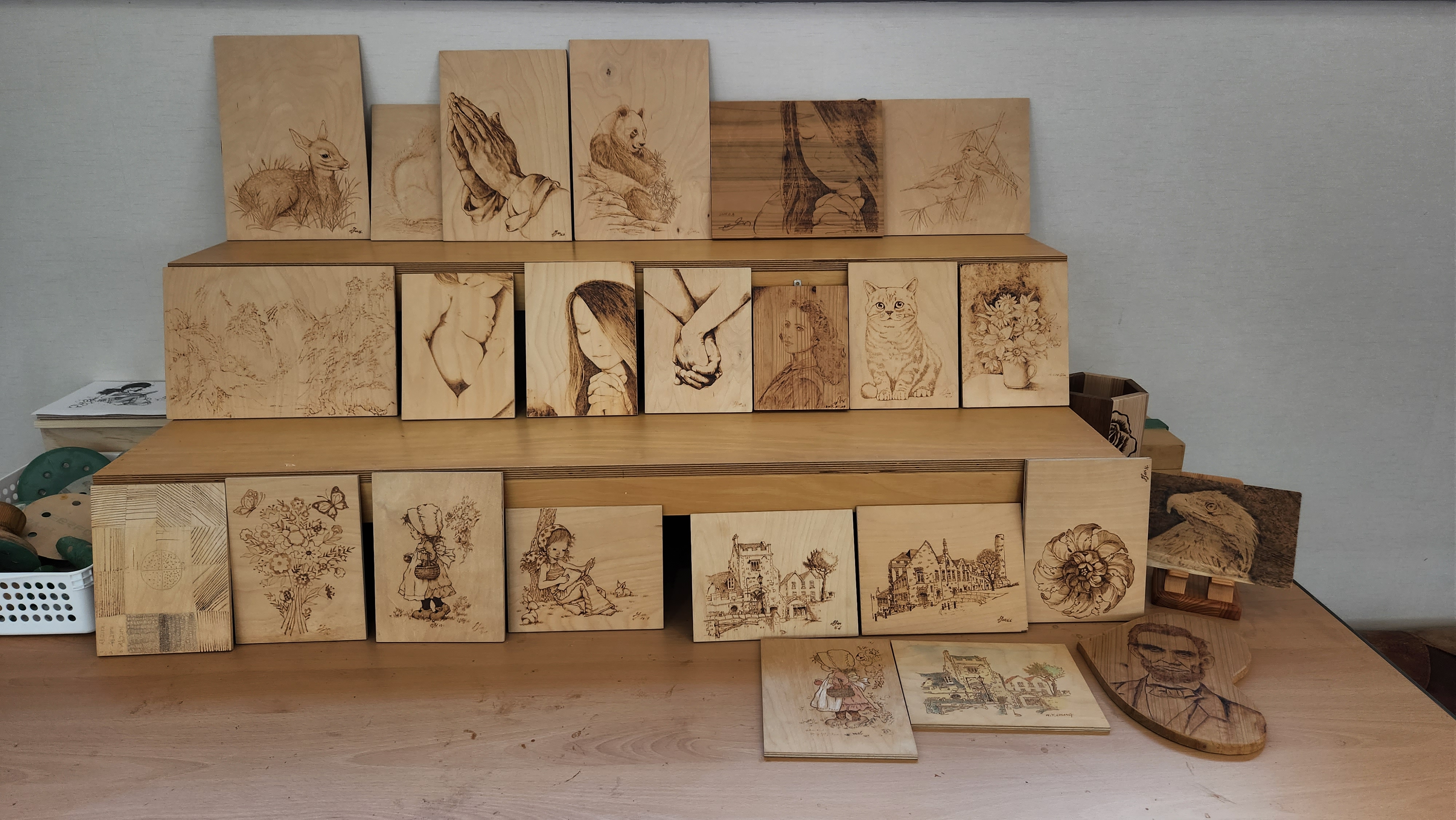 처음에 수강생분들 오시면 이 판재를 나눠드리고, 지금처럼 이런 선 긋기 연습을 제일 먼저 해요. 그 시간이 실은 제일 중요해요. 이분들이 처음 버닝기를 접하기 때문에 (판재에) 연필 선으로 다 그어 놓은 다음에 이걸 따라서 (팁으로) 선을 긋는 거예요. 그러다가 시간이 지나면서 기초 단계에서는 (진열된 작품을 보여주시며) 이런 캐릭터 모양이라든가. 이런 ‘건물이 있는 풍경’이라든가 이런 거를 작업을 하고요. 범주는 넓어요, 버닝이라는게. 예를 들어서 테이블이 하나가 있는데 테이블이 다 맑기만 하다 그러면은 테두리를 둘러 가지고 패턴을 만들 수도 있는 거예요. 저한테 배우신 분들은 주변 지인들 사진 받아다가, 인쇄 해 가지고 버닝으로 그려드리는 분도 계세요.