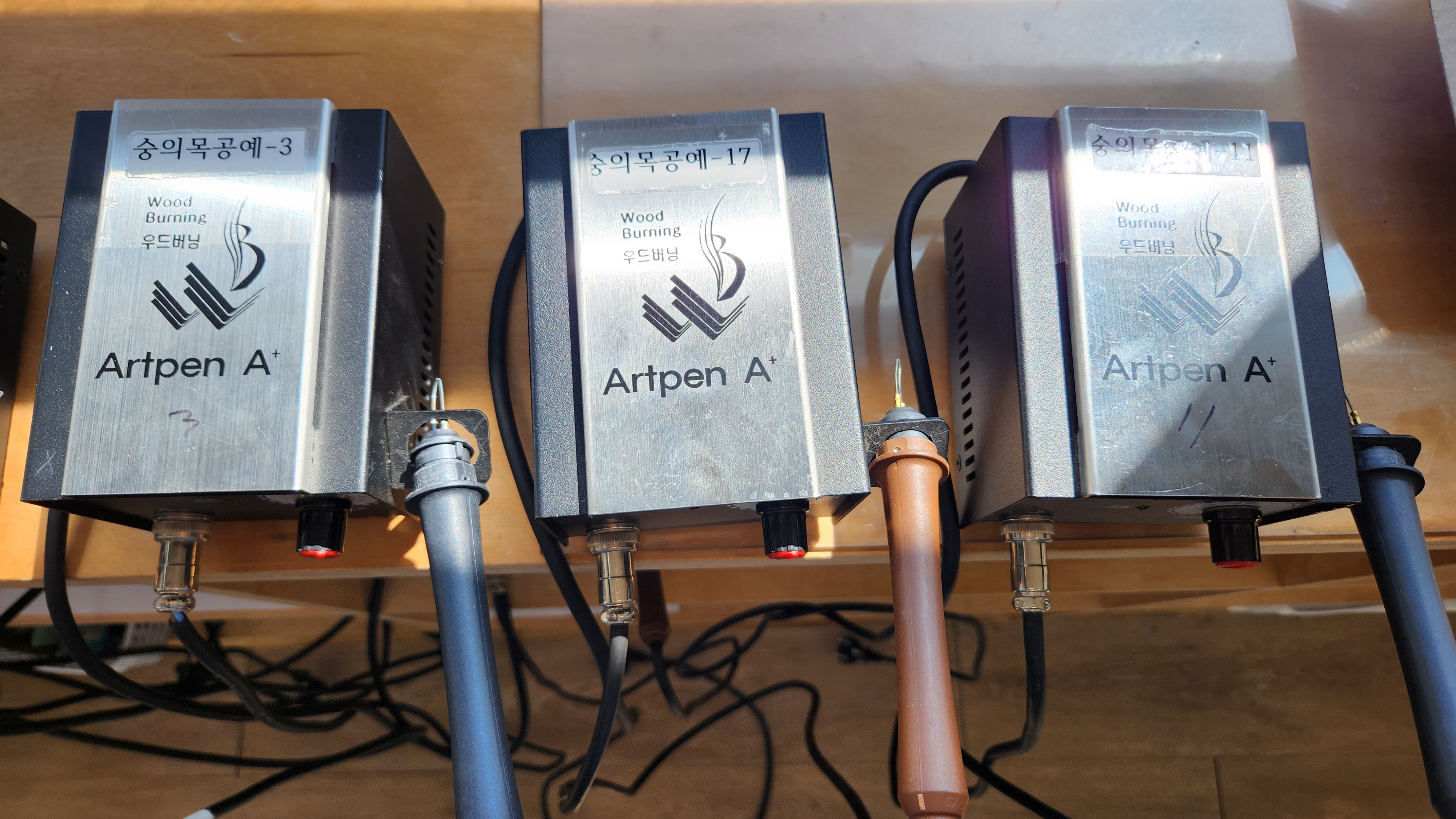우드버닝기는 온도가 조절되는 게 있고 안 되는 게 있어요. 온·오프만 되는 기능이 있고. 현재 저희가 보유하고 있는 건 다 온도가 조절되는 거라서. 이 펜(팁)을 얼마큼 본인이 용이하게 쓸 수 있느냐에 따라서 작품의 질이 달라지죠.