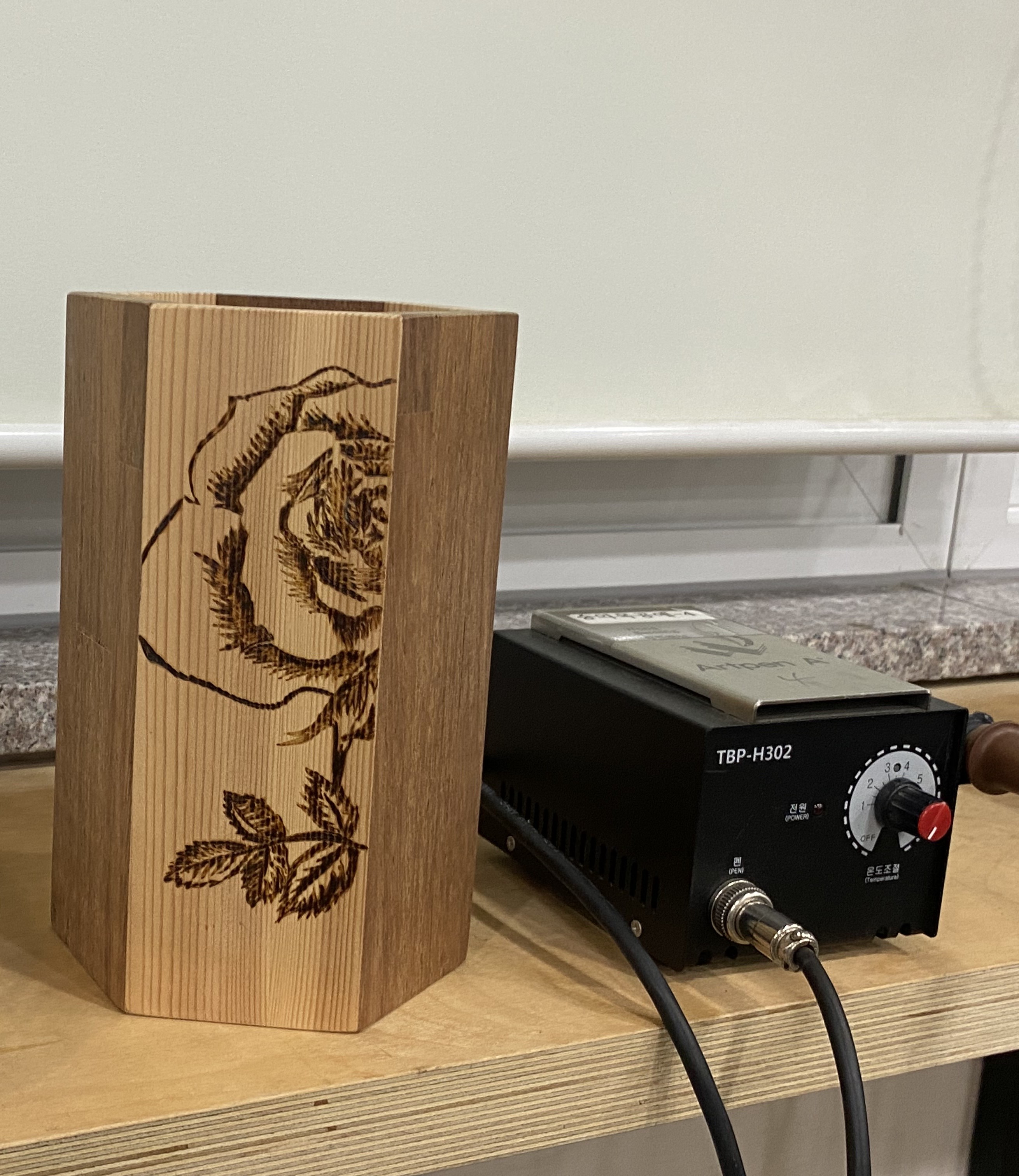 이게 기계잖아요. ‘우드버닝기’라고도 하고 ‘인두기’라고도 해요. 기계를 다루는 방법을 습득 하는 게 우선이니까. 이게 보시면 앞에 ‘팁’이 탈부착이 되는 건데 종류가 다양해요. 펜처럼 넓은 게 있고, 구슬처럼 된 것도 있어요. 팁이 활용 범위가 넓기 때문에, 이거를 완전 마스터는 아니어도 ‘이 정도 갖고 이거를 활용할 수 있겠다.’ 싶을 정도로 적응하는 데는 시간이 걸려요. 계기는 어쨌든 센터장의 제안으로 제가 우드버닝을 접했고. 현재까지 우드버닝 지금 한 7년 돼 가는 것 같아요.