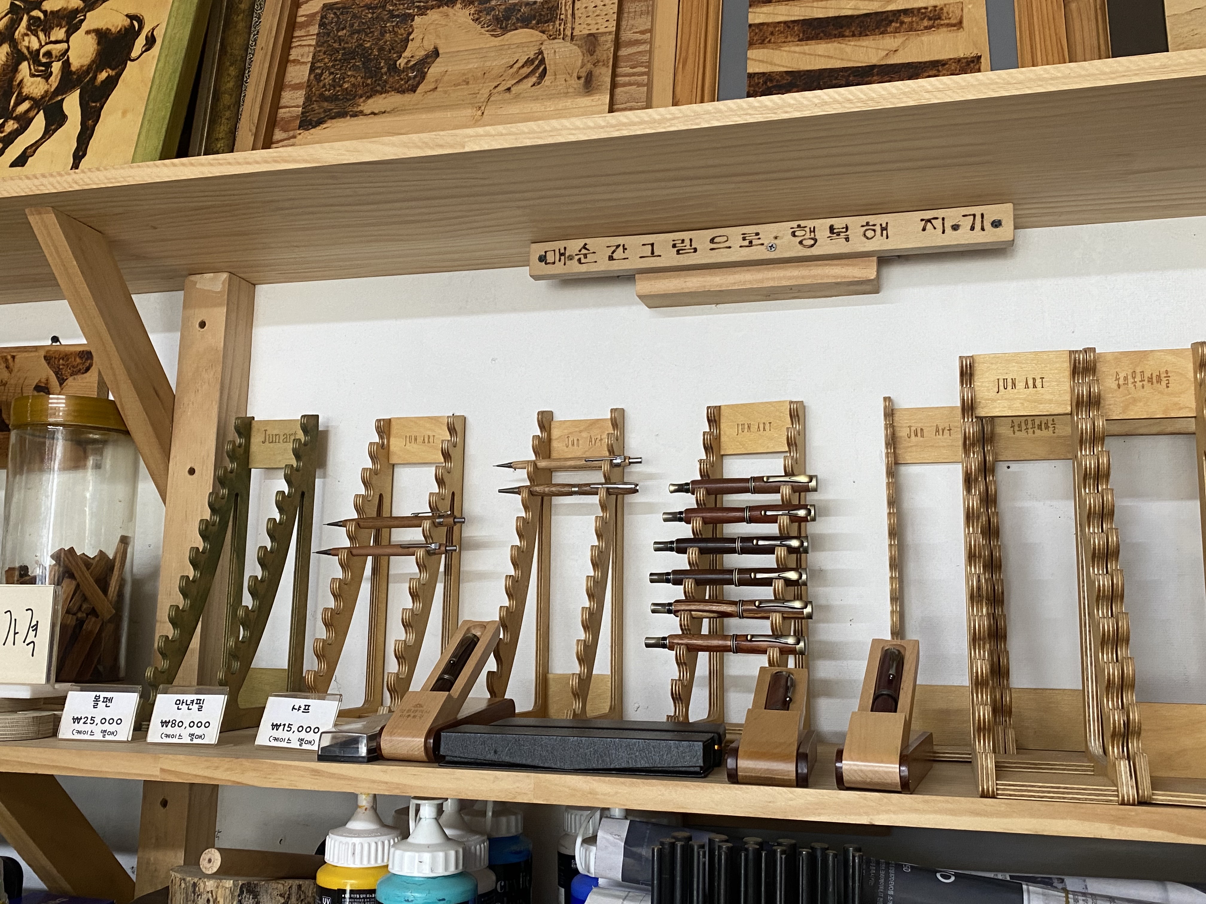 그것도 참, 그러니까 벽화도 제가 그런 얘기했잖아요. 직장을 다니고 있는데 아는 형님이 그림 그려달라고 해서 뜻하지 않게 그림 그렸는데 그게 재밌어서 그 분야로 뛰어들었듯이 실은 버닝도 마찬가지예요. 해보니까 나무 불태우는 게 좋으니까, 다른 분들한테도 추천할 수 있는 거잖아요. 그것처럼 우드펜 같은 경우는 옆에 지인분이 “니가 목공예 (마을에) 있으니까, 이분들 하고 겹치지 않기도 하고. 손재주 있으니까 한번 해보는 게 어떻겠냐.” 제안을 받아서 뜻하지 않게 그냥 “우드펜? 나 잘 모르는 분야인데.” 마침 이 밑에 서울공예 사장님 아는 분이 우드펜을 하셨던 분이 계셨어요. 그분하고 그냥 “전화 통화 한 번 하자.”고 그래서 그날 바로 술을 한잔 했어요. 그리고 그다음 날 제 공방에, (우드펜 제작) 기계를 여기다 갖다 놓고 “우드펜 하는 걸 알려주겠다.” 하셔 가지고 그분 기계를 다 갖다 놓고. 또 그분이 아는 수제펜 만드는 부품들이 있을 거 아니에요. 그거를 바로 그날 또 사러 갔어요, 그래서 그다음 날부터 작업을 시작을 했고 자연스럽게 그 스승님한테 전수를 받은 거죠. 전수 받고 한 달 정도 됐나, 하다 보니까 저도 어느 정도 손에 익더라고요. 그래서 지금까지 우드펜을 하게 된 거죠.