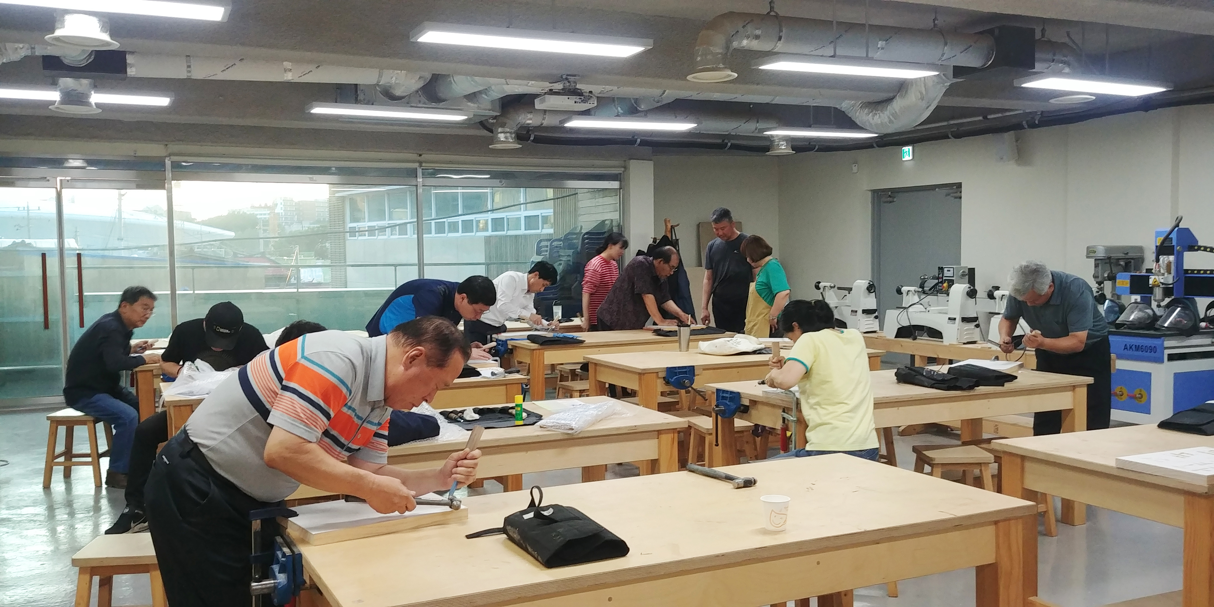 산림조합 중앙에서 운영하는 목공의 기술 급수 자격을 준하는 교육이 있었는데, 친목회 회원들이 주기적으로 급수 시험을 보러 몇 번 다니더라고요. 기능보다도 객관식으로 그런 시험인데 목공 센터가 들어서면서 평생 학습 교육하게 되었죠. 나는 이 계통에 원로이다 보니, 내 전문 분야의 서각 강의를 부탁하더군요. 그래도 처음엔 사양을 했죠. 나보다 더 훌륭한 사람을 모셔다가 가르치라고. 근데 우연치 않게 내가 강의 진행을 하게 되어 사력을 다해 지도했어요. 한 3~4년간을. 아주 생소한 초보자들을 10시간 만에 교육을 해서 작품을 만들어 가져가게 하려니 정말 처음에는 자신이 없고 답답하더라고요. 그래서 내 나름의 프로그램을 짜서 10시간을 열심히 가르쳤더니 나중에 갈 때는 작품 두 개 정도는 가져가는 그런 경우가 생겼어요. 그러다 보니 교육생들한테 제가 존경을 많이 받고 호감을 많이 받다보니 남구청 관계자분들도 굉장히 칭찬을 많이 해주셨어요. 정말 최선을 다해 지도했어요. 근데 작년인가? 올해 초부터인가? 민영화를 시킨 거죠. 남구청에선 그래도 여전히 나한테 이걸 진행을 해줬으면 하고 얘기를 하더라고요. 이제 나도 좀 편하게 살고 싶고 해서 다른 분으로 교체를 해서 진행을 해 봐라 하고 나는 빠졌죠.