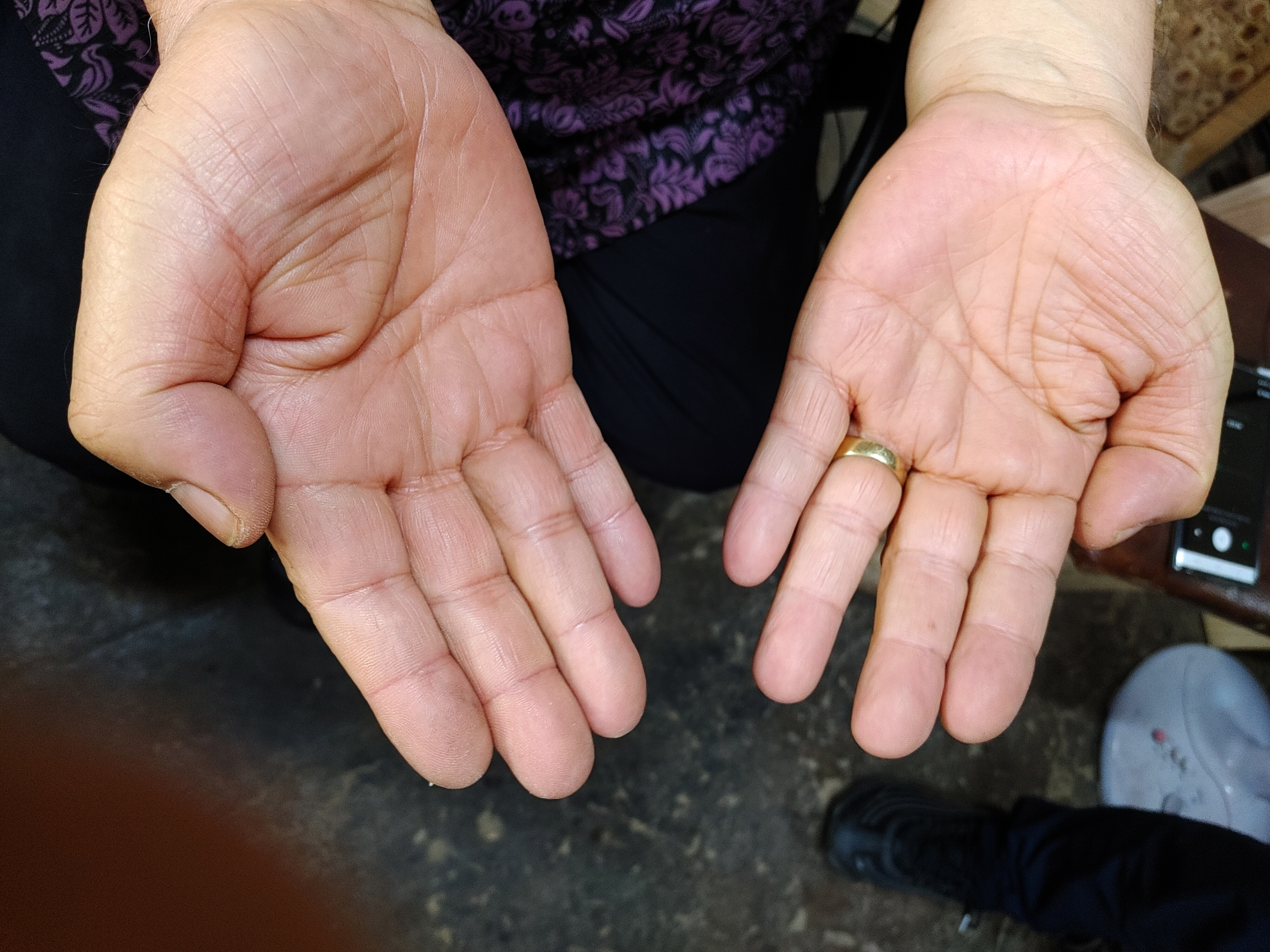 그런 건 없습니다. 다만 70이 넘어버리니까 손을 많이 쓰니까 손 관절이 조금은 와요. 예전엔 제가 힘도 세고 건강했거든요. 제 침대에는 물리 치료기들이 있어요. 손에 뭐 지압하는 거, 그다음에 이렇게 찜질 팩, 암마, 이런 것들이 내 잠자리에 언제부턴가 동반을 하고 있어요. 손 관절이 아플 만도 하죠. 이 맨손으로 삼남매를 다 대학교까지 가르치고 키워서 결혼까지 다 시켰으니 고장이 안 나겠어요.
