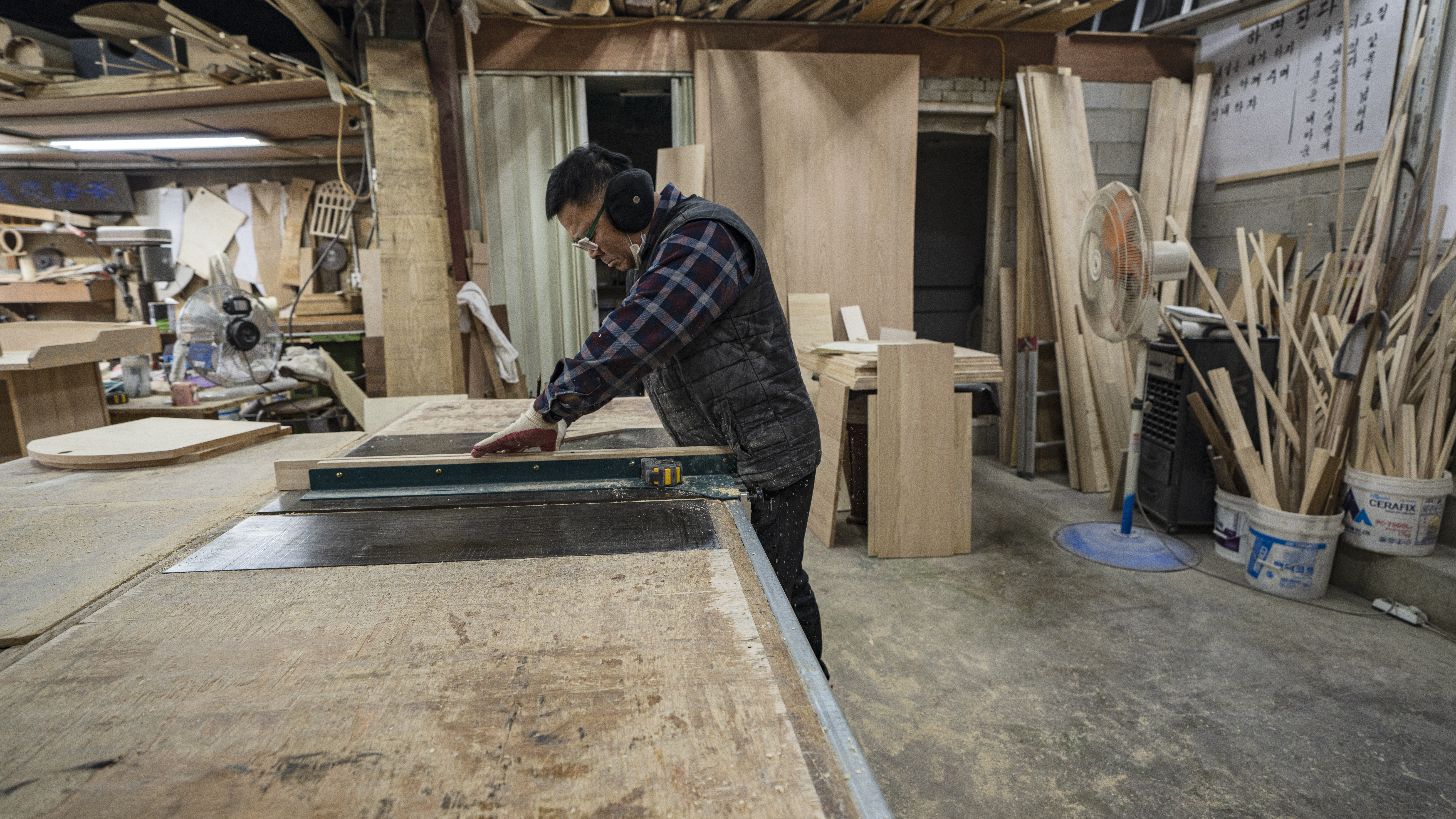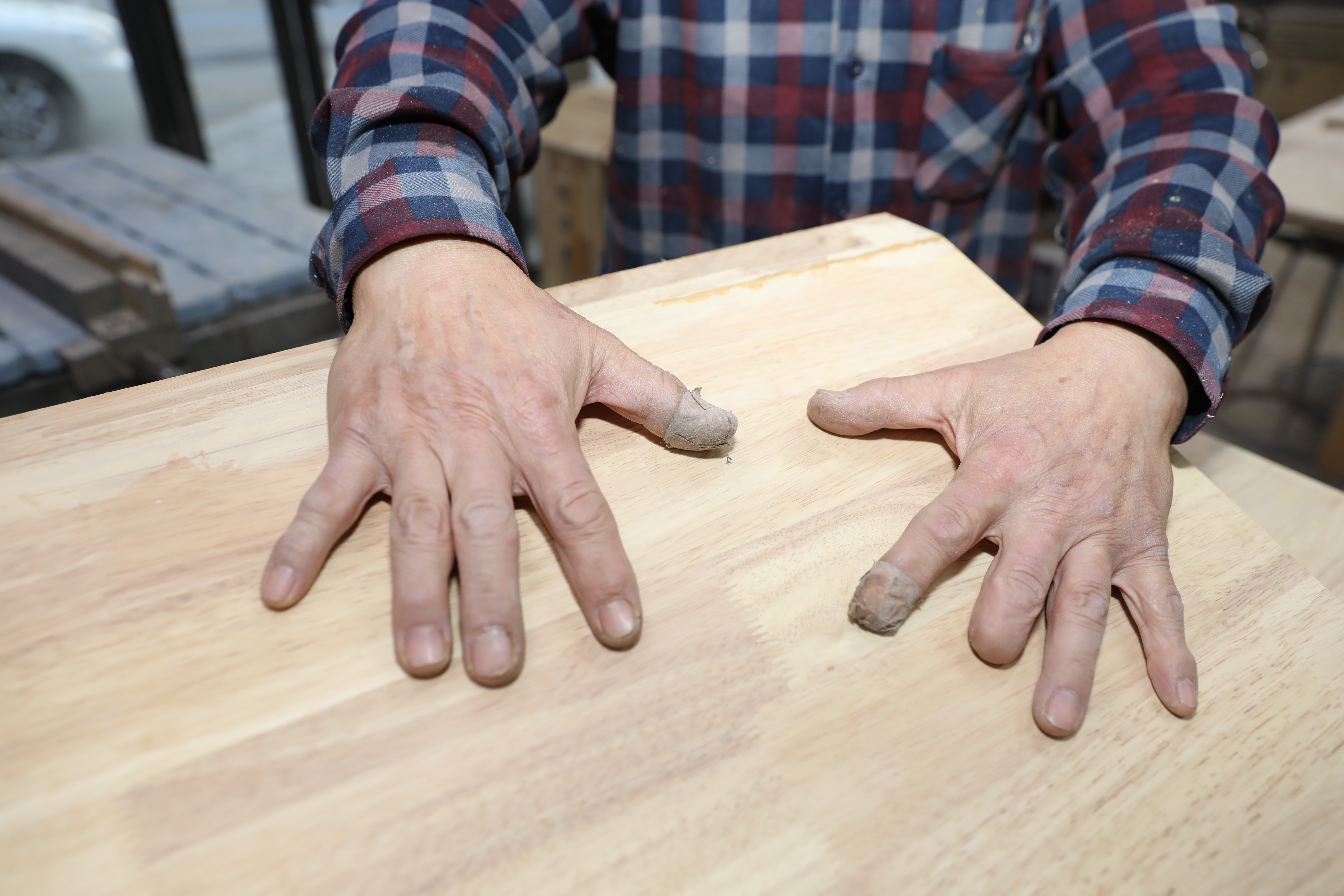지금 같이 일하는 직원은 안 지가 40년이 넘었어요. 이 동네 토박이가 아니라, 어렸을 때 다니던 반장 댁 아들인데 저 친구가 나중에 하겠다고 해서 왔어요. 점잖고 좋은데 목공이라는 게 솔직히 굉장히 어려워요. 이게 쉬운 게 아니에요. 좋아해도 막상 이렇게 보면은 어렵다는 걸 느껴요. 왜냐하면 열정은 물론 기본과 응용이 제일 중요해요. 그리고 기계 다루는 거는 위험스럽고 무서워요. 저 자신도 아직도 기계가 무서워요. 제 손도 이렇게 나가고. 제 주위에 목공 하다가 손 나간 사람이 많아요. 그게 이렇게 순간이에요. 자만도 있지마는 기계를 쓸 때는 순간 무지하게 빨리 판단하고 해야 해요. 하여간 이 목공은 어떤 일이든 다 무서운데 이건 특히 더 무섭더라고요.
