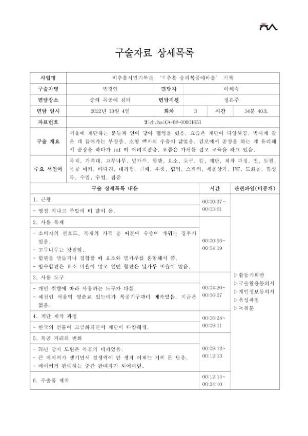 지역의 특색이 살아있는 숭의목공예마을에서 목공예의 일을 오랫동안 해 온 장인들의 구술로, 목공예의 변화상과 지역의 다양한 이야기들을 기록하고자 함.