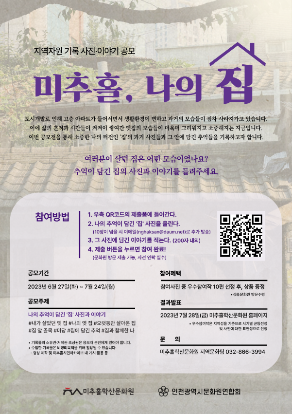 미추홀학산문화원은 오랜 정서를 담은 집의 사진과 그 안의 추억 이야기를 모아내는 공모전을 운영했습니다.