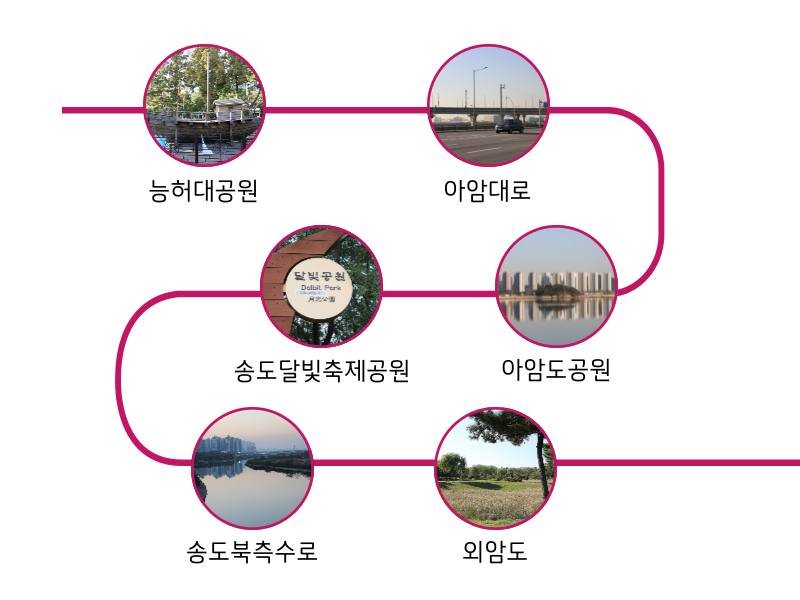 미추홀은 한반도에서 서해를 통해 나가는 관문이었다. 능허대는 공원으로 남아있으며, 드넓은 갯벌로 먼우금이라 불렸던 송도갯벌은 매립되고 아파트가 솟았다. 그러나 북측으로 수로가 만들어졌고 그 길을 따라 걷다보면 보이는 능선이 과거 바다에서 인천을 바라보던 느낌이 그대로 있다. 현재의 자리에서 과거의 흔적을 바라볼 수 있는 코스이다.