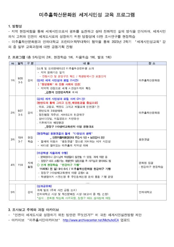 미추홀학산문화원과 인하대학교 프런티어학부대학은 협약을 통해 2023년 2학기 '세계시민성교육' 강의 중 일부 강의를 공동기획하여 지역 대학의 교양 수업이 지역에 뿌리를 둔 시민으로서의 실천 고민을 통해 세계시민으로 나아가기 위한 취지의 교육과정을 진행했습니다. 지역이해 및 현장체험을 통해 세계시민으로서 평화를 실천하고 생태 친화적인 삶의 방식을 인식하여 세계시민의식 고취와 세계도시로서 성장하기 위한 취지의 강의였습니다.