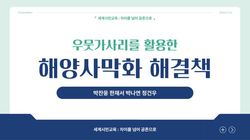 - 주요내용: 2010년 조사에서 인천 앞바다에 갯녹음 현상, 즉 해양 사막화 현상이 확산되고 있음에도 인천시민의 무관심과 대책이 부족한 문제를 인지함에 우뭇가사리를 활용한 해결책이 큼에 캠페인을 활용하여 인지도 확산과 참여형 쓰레기 제거활동등을 진행할 수 있도록 제안