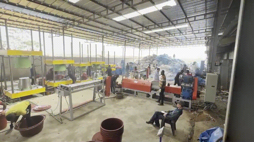 계기는 아버지가 아시겠죠. 아버지가 처음에 하셨으니까. 근데 고무대야는 예전에 우리가 재활용을 많이 안 했잖아요. 요즘에는 재활용 비닐, 나일론이 많이 나오니까 폐비닐을 세척해서 압출기에 넣어 녹이면 밀가루떡처럼 나와요. 그거를 다시 로라에다 밀어서 팽팽하게 펼쳐 다시 프레스에 이제 금형이 올라가 있거든요. 그럼 거기다가 그걸 씌운 다음에 프레스를 작동한 후 제품이 나와요. 저희는 금형과 기계만 만들어요.
