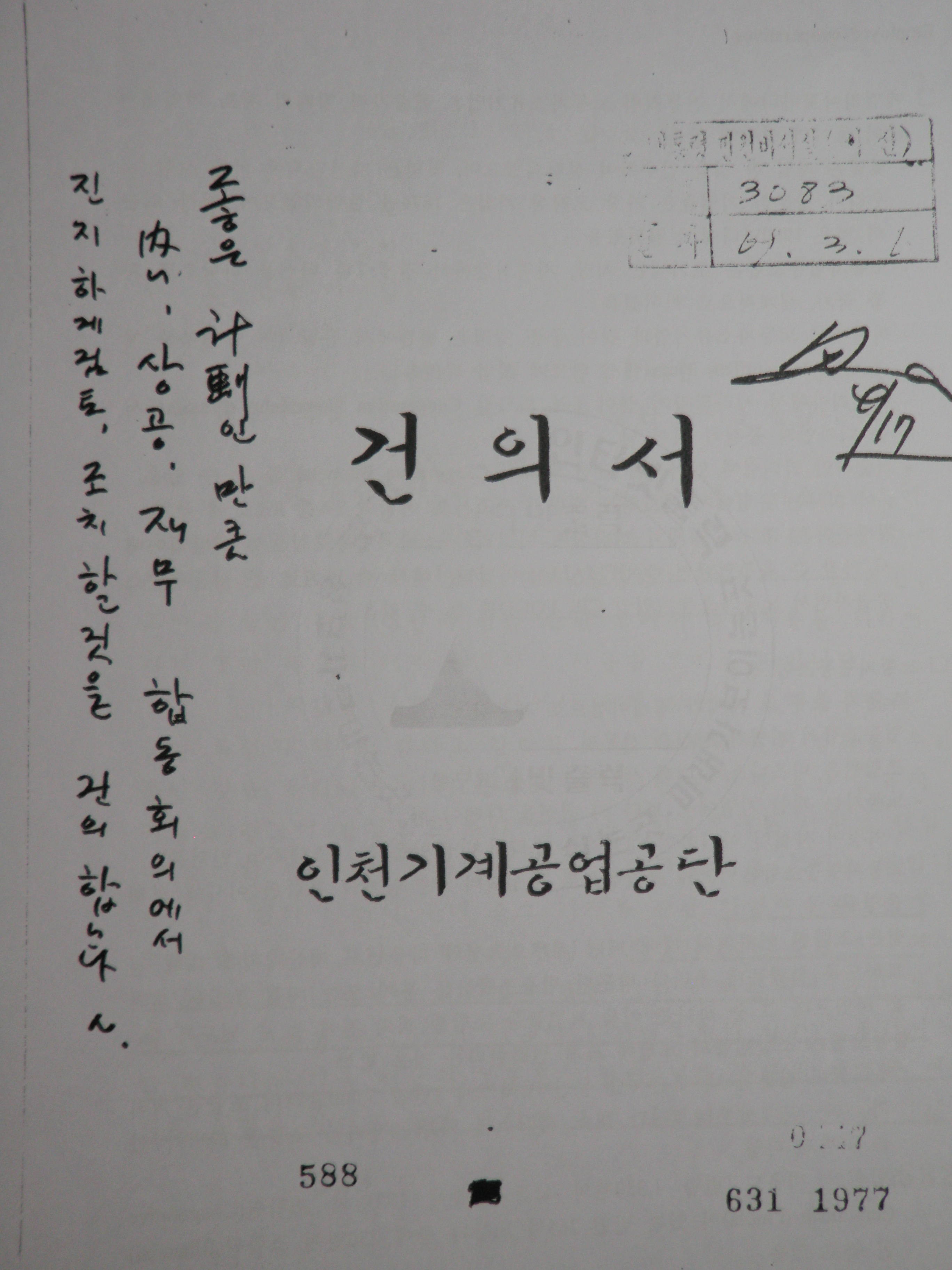 1968년 염전부지 분할매각 결정으로 인천상공회의소는 주안제2수출공단 조성 외에 기계업종을 특화하는 공업단지 조성을 계획하였다. 인천기계공단 조성을 위해 경인기계공업협동조합을 중심으로 기성회 설립(1968.12), (사)인천기계공업공단 창립총회(1969.2)를 개최하고 국가에 건의서를 제출하는 등 기계공업 동일업종의 연대와 네트워크로 정부 승인 및 지원을 받기 위해 동분서주하였다. 그 결과 대통령의 업무협의 지시와 상공부 승인(1969. 4. 28.)을 받았다.