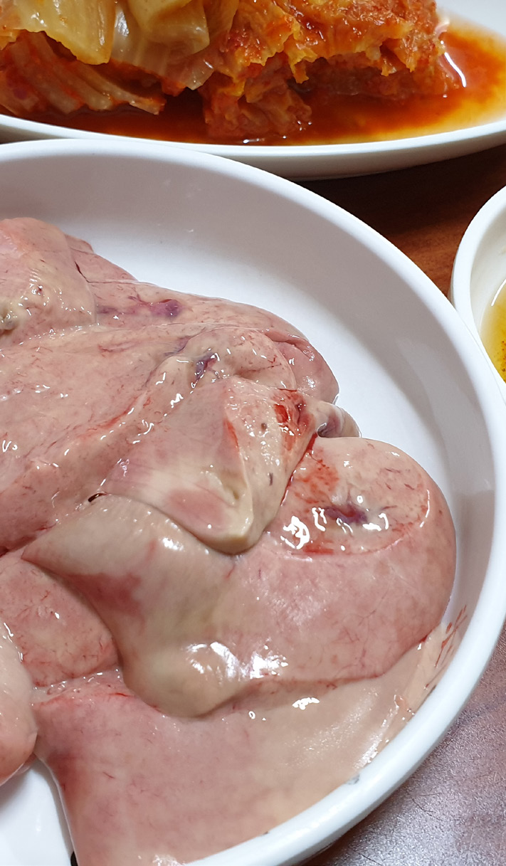 <별주부전>에 토끼가 헛된 욕심으로 간을 내줄뻔한 사연을 재밌게 비틀어 쓴 윤동주의 작품이다. 그만큼 양심이란 지키기 어려운 것이기에, 윤동주는 금세 상하기 쉬운 간에 빗대어 “습한 간을 펴서 말리우자”라고 노래한 것이다. 윤동주는 양심과 지조의 상징인 저 간을 젊은 시절의 목숨과 맞바꾸어 우리 마음에 영원한 청년으로 남았다. 나는 주인이 꺼낸 싱싱한 홍어의 간을 보며 그 순결한 청년을 떠올리지 않을 수 없었다. 왜냐하면 홍어의 간이야 말로 조금만 시간이 지나도 삭힌 냄새가 심하게 코를 찌르기에, 오로지 신선한 상태에서만 그 진면모를 맛보여주기 때문이다. 주인이 홍어에 대한 지조와 정성이 없다면 저 홍어의 간을 지켜낼 수 없는 것이다. 그러므로 이 음식은 대견한 음식이고 쉬 맛볼 수 없는 값진 것이다.