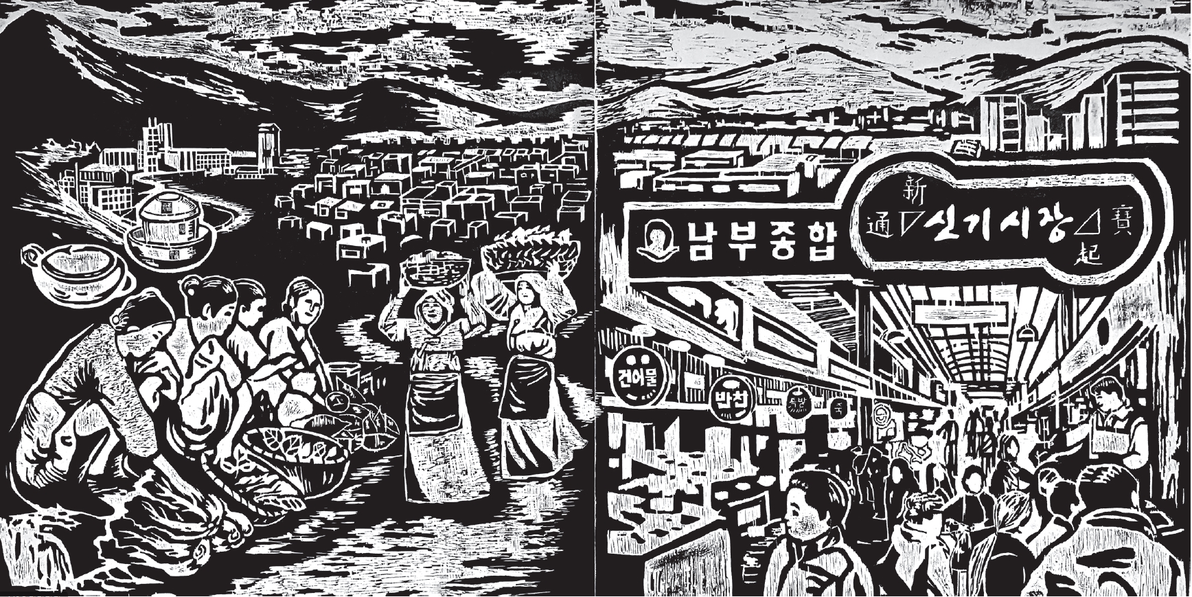 다른 구에 비해 재래시장의 수가 많은 미추홀구의 특징을 살려, 신기시장과 그 주변에서 살아가고 있는 사람들의 이야기를 이미지화하여 판에 새기고 온몸으로 눌러 노동하듯 주민들이 직접 찍어낸 작품입니다. 진흥요업(중앙도자기) 입구에서 푸성귀를 팔며 시작된 신기시장, 이주민들이 와서 살았던 10평 쪽방촌 그리고 현재의 신기시장 모습을 담아냈습니다.