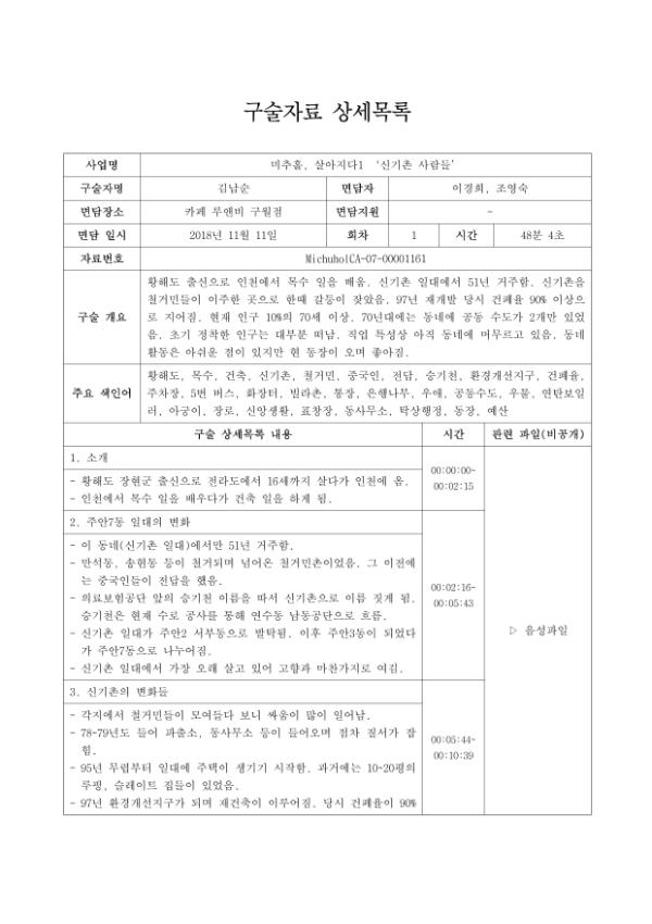 구술자 : 김남순 (주안7동 통장자율회장, 신기촌 일대 51년 거주)