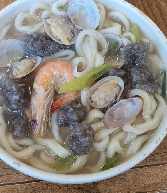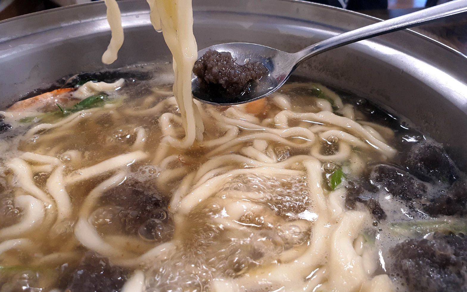 미더덕과 오만둥이라는 거예요. 미더덕도 써보긴 써봤는데 향이 너무 강해서 육수의 은은한 향 맛을 내기에는 적합하지 않아서요. 가격도 비싸지만 맛도 안 맞더라고요. 그래서 오만둥이를 갈아 가지고 넣죠. 처음에는 원래는 통으로 넣었는데 먹다 보니까 싫어하시는 분들도 있고, 어떤 분들은 너무 모양이나 이런것들이 좀 부담스러워하시는 분들도 계시고 그래서 저희가 아예 갈아서 넣어요. 아주 좋은 아이디어 같아요. 지금 보니까 이렇게 씹는 맛도 있고, 재미도 있고. 국물의 시원한 맛과 바다 향도 좀 느껴지고.