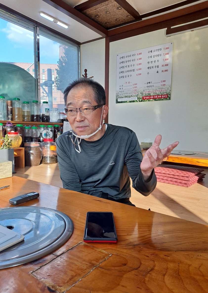 원래 건축을 했었어요. 건축 일을 한 30년 가까이 하다가 경기가 계속 안 좋아 졌어요. 그 당시 매제가 식당 일을, 그때 제가 이거 하기 전에 한 25~6년 그 정도로 오래 했으니까. 이 메밀 100% 하는 기술은 사실 제가 알기로도 우리나라 기술 갖고는 안 된다 그러더라고요.