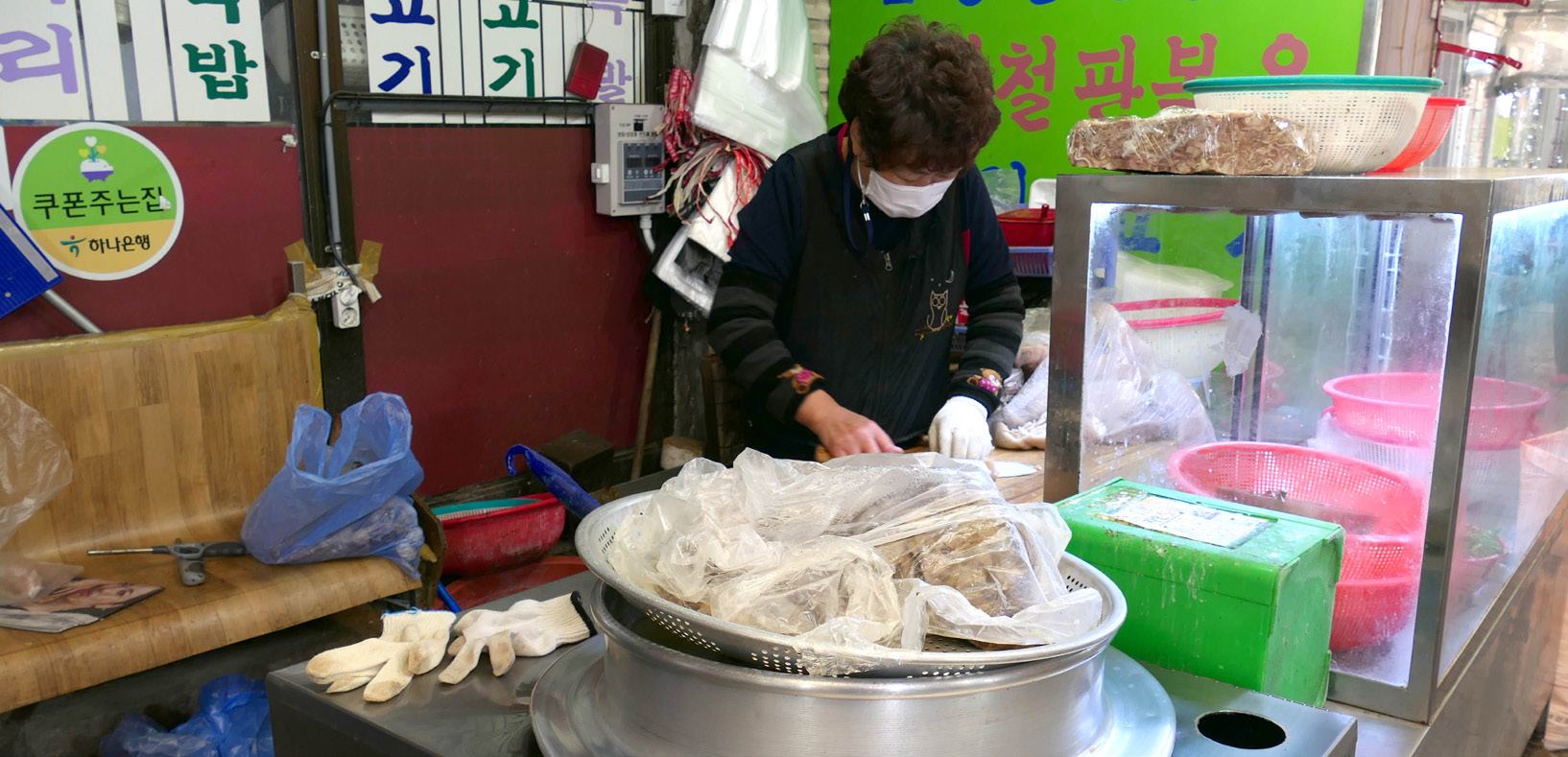 나이가 좀 먹은 사람들은 오면 서비스 좀 주라 하고 그런 사람도 있고, 요새 젊은 사람들은 막 주면 주는 대로 그냥 먹어요. 젊은 친구들은. 나이 먹은 사람들은 술 먹는 사람들은 우리가 좀 잘라주지. 먹으라고. 젊은 사람도 그게 정이었단 말이에요. 전통시장에. 그래서 사람들이 찾고 이렇게들 하고 있죠. 원리 원칙대로 하다 보니까 정이 없어. 그냥 저희 아들하고도 얘기를 하면 딱딱 끊어지다 보니까 정이 없어요. 옛날처럼 막 하고 또 이제 사장님하고도 농담도 주고받고 그러면서 이제 어느 때는 손님 없고 하면 약주 좀 하시면 같이 술 한잔하자 이렇게 하고 그랬었는데 지금은 없는 것 같아요. 없고요. 나는 손님들 앞에서 술을 안 먹지. 아는 애들 친구들이 오고 이러면 어쩌다가 친목계 있고 그러면은 한두 잔은 마셔도 많이는 안 마시지. 그래서 요새는 거의 끊다시피. 왜 그러냐면은 당도 있고 이러니까 거의 끊었어요. 요새는 술도 많이 먹는 사람도 없고 그러니까 나도 좋지. 요즘에는 소독하기도 귀찮고 의자 같은 데 다 소독하고 닦고 뿌리고 닦고 그 것도 귀찮아요. 아침에 내가 어떤 때는 6시 좀 넘어서 나와요. 그러면 소독하는데 시간이 좀 걸리거든요. 그것도 또 닦아. 수분도 딱 씻어야 되는 거지. 의자마다 다 다니면서 다 뿌리고 닦고 해야 돼. 화장실부터 전부 다 변기통도. 그러니까 매일 내가 할 일이 많은 거야.