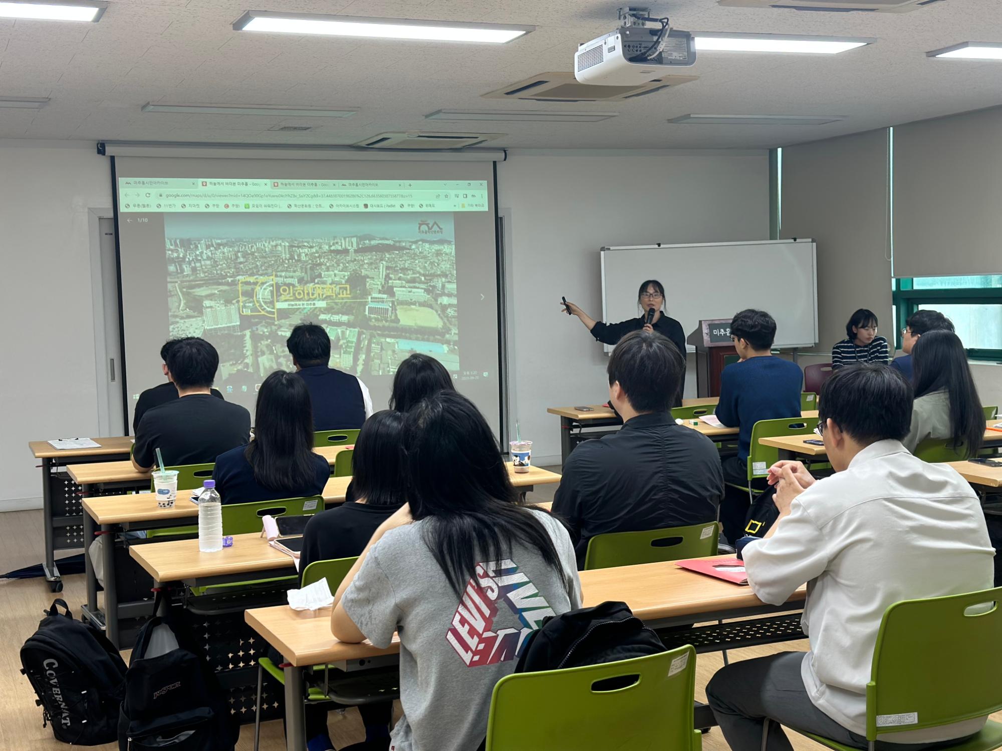 미추홀학산문화원이 인하대학교 프런티어 학부과 협약을 통해 2023년 2학기 '세계시민성교육'강좌의 일부 과정을 공동기획, 운영하였다. 사진은 1차시인 '동양평화와 전환 사회의 인천'의 현장사진이다. 강의는 김현석 인천민속학회 이사가 맡았으며, 지역적 관점에서 시작하여 세계 시민성까지 확장하는 시선을 담은 강의가 진행되었다.